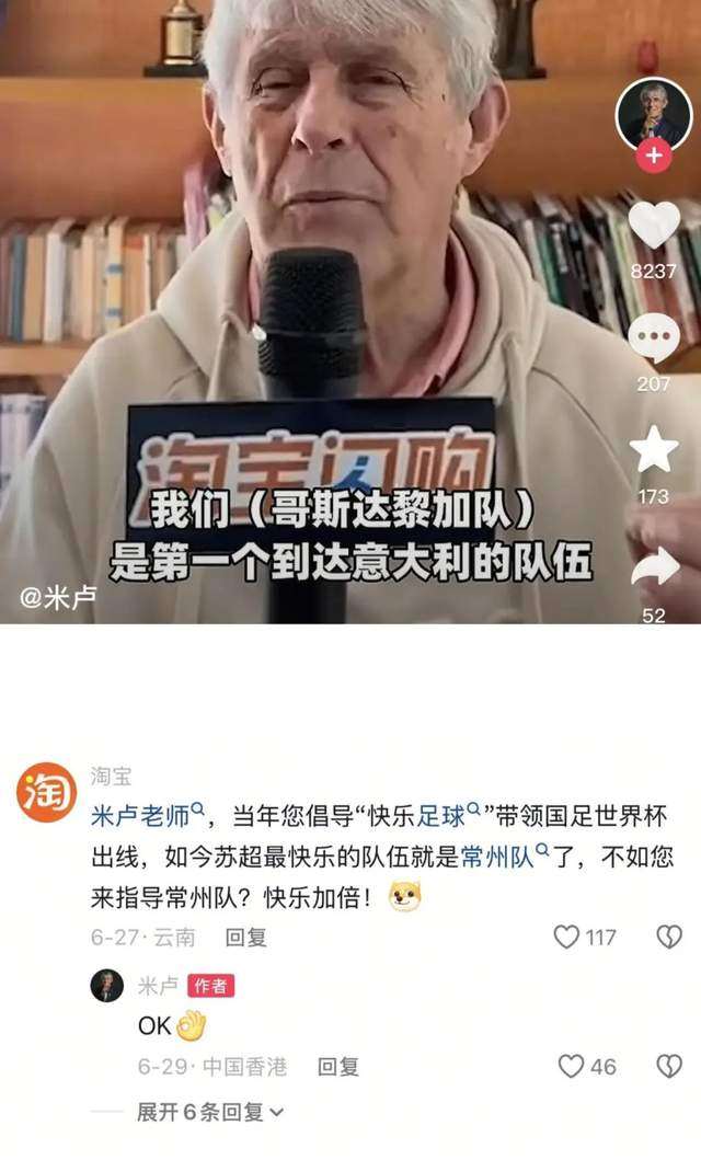 接着开始在球队保障上下功夫:不仅请来中超悍将黄紫昌给常州队队员交流研讨,还在前国足教练米卢的评论区底下求指导,结果还真的采访到了米卢。