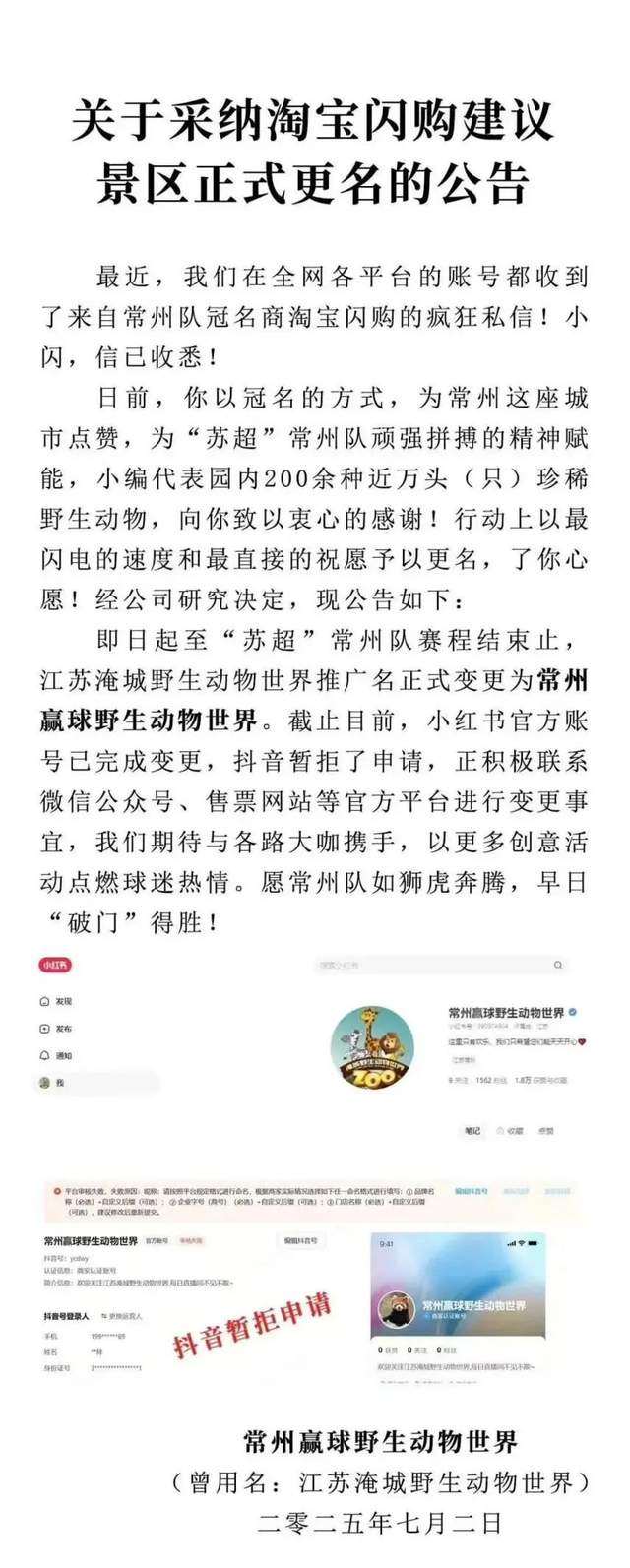 最终在淘宝闪购的“死皮赖脸”下,宝林寺慈悲为怀地同意“暂时改名”;“江苏淹城野生动物世界”也将名字改为了“常州赢球野生动物世界”,并表达了对淘宝闪购真诚策划的感谢。
