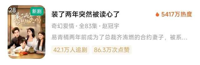 《装了两年突然被读心》改编自番茄小说《装了两年舔狗后大佬突然能读心了》,一共83集,抖音端原生播放量504.9w。截止7月4日,该剧红果热度值达到5417w,站内热播榜排名第28位,飙升榜单排名第8位,收藏量42.1万,追剧人次达42.1万,收获86.3万次点赞。