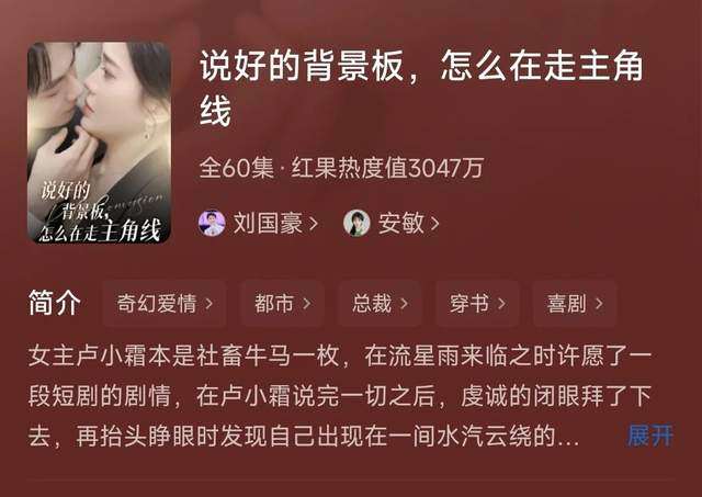 《说好的背景板,怎么在走主角线》一共60集,截止7月4号,该剧红果热度值达到3047w,抖音端原生累计播放量32.1万,快手热播累计播放量为6931,收藏量为1.1万。