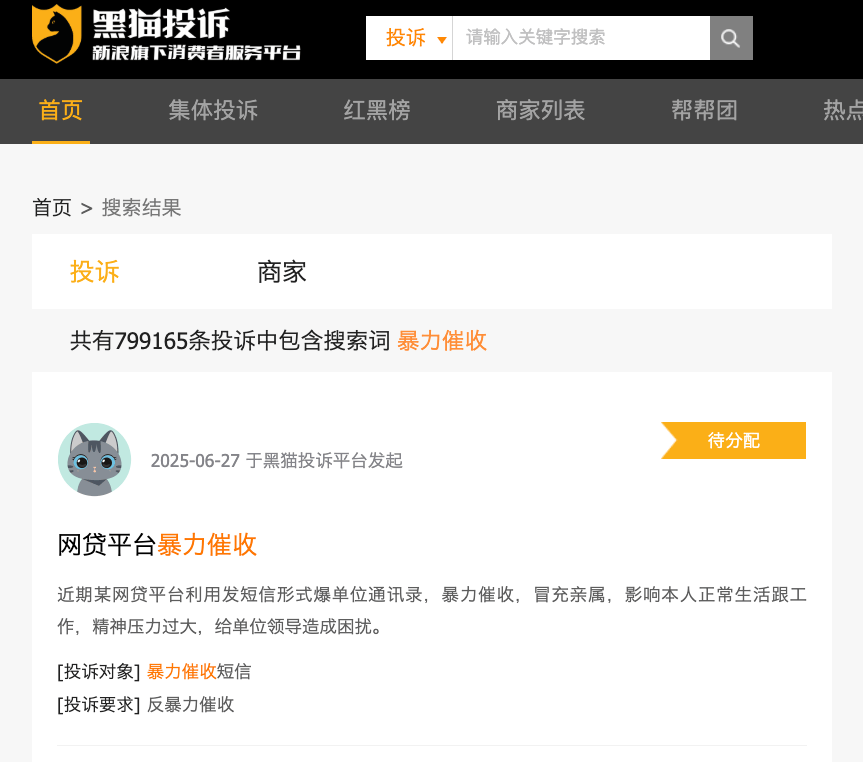 马迪的遭遇绝非个例。黑猫投诉平台显示,截至目前,以“暴力催收”作为关键词的搜索结果多达79.91万条,其中绝大部分都与互联网金融平台相关。而据第一财经3月中旬统计,这一数据约为70万条,也就是说,3个月时间里,仅黑猫一个平台上即新增了近10万条投诉,增量超过此前多年累计投诉量的10%。