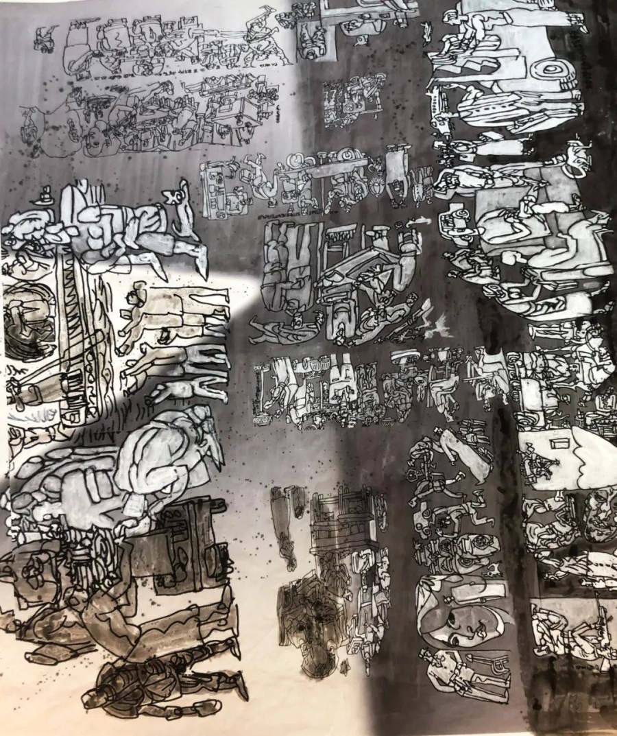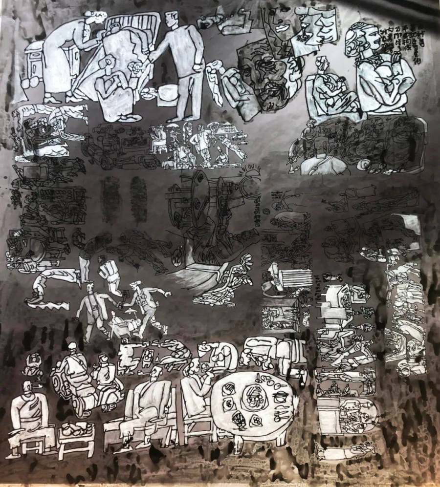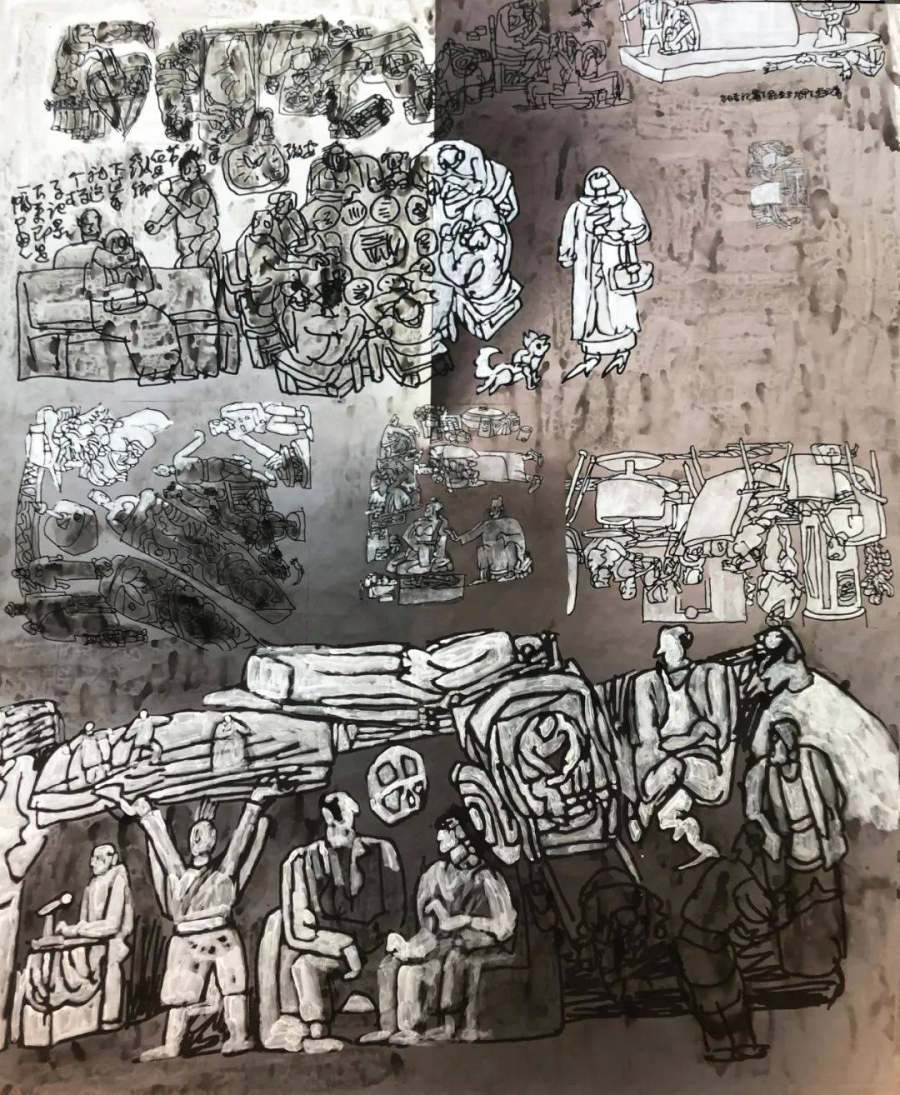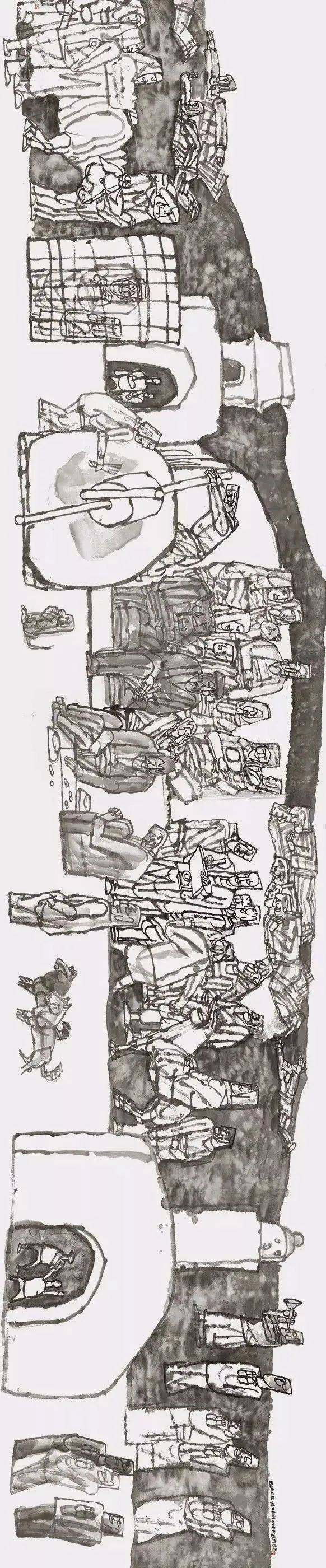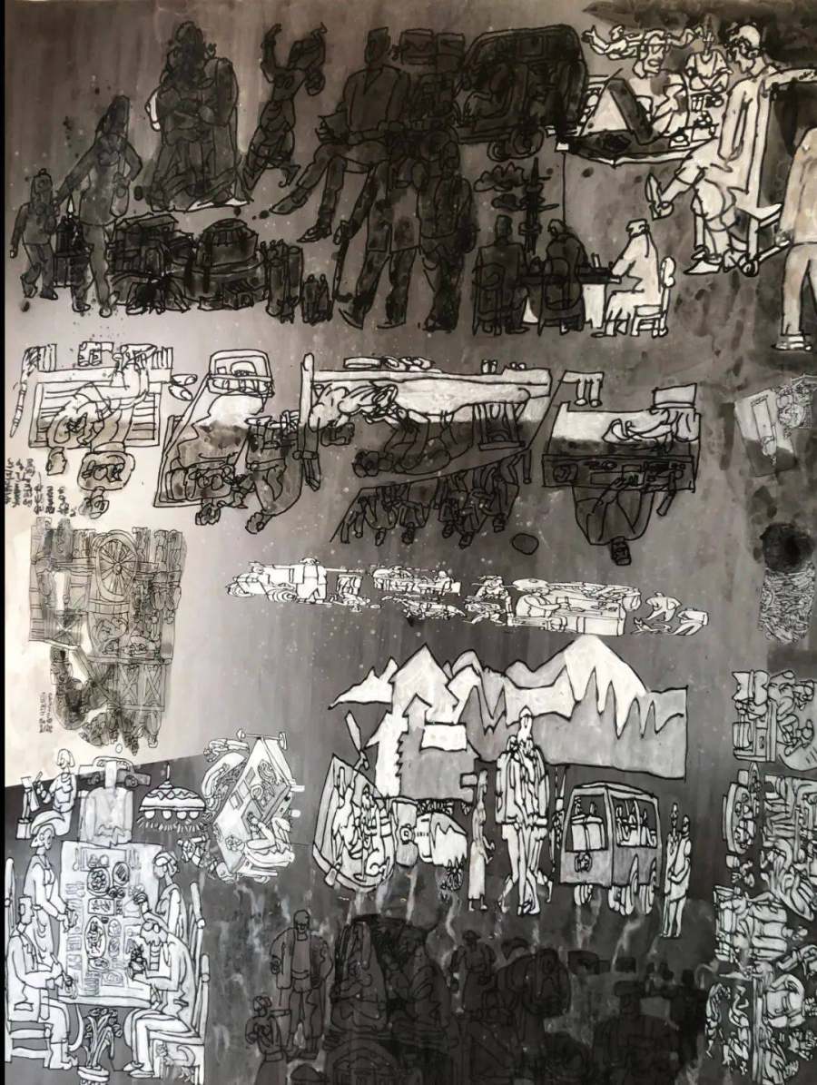 长安古道之苍茫,西域无垠之绿洲,无一不是其赤子心的体现。展览精心设计了主题探索、丹青意蕴、生活写生、水墨精神四大板块。其2025年新作《丝绸之路·人来人往》系列在上海首次亮相,打破了时间、空间、地理维度的跨度,冲击了一切民族与地域的局限,释放创作自由度,以超尺幅的水墨装置重构了丝路人文图谱。现场巨幅作品环绕展厅,无论是主题探索中《阿房宫赋》“盘盘焉,囷囷焉”的解构性的视觉冲击,还是《苦水社火》细密繁杂的民俗气象、生活写生中一组组截然不同的城市描绘,均表露出其扎根文化而诉诸新语的艺术哲学。