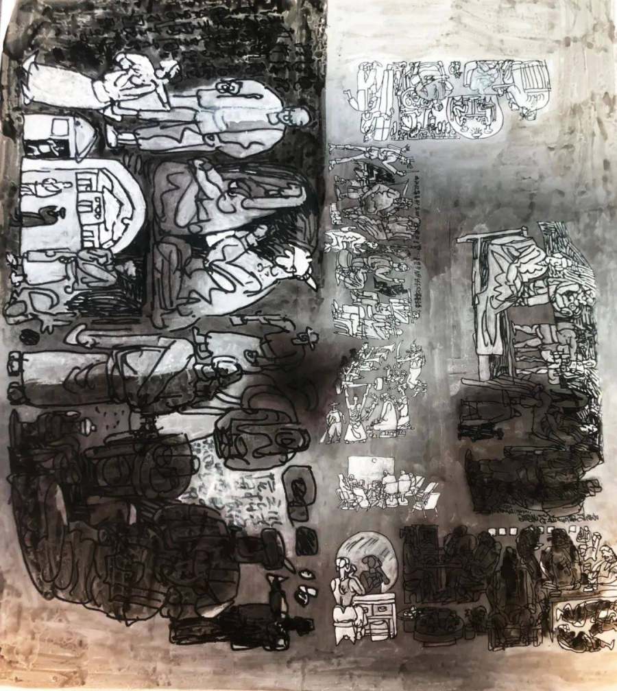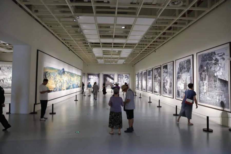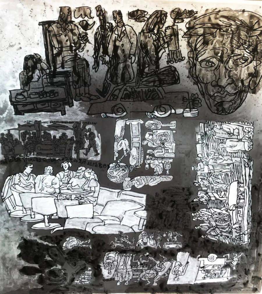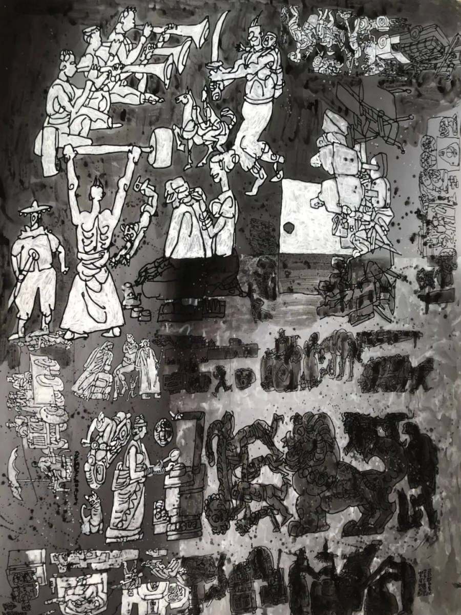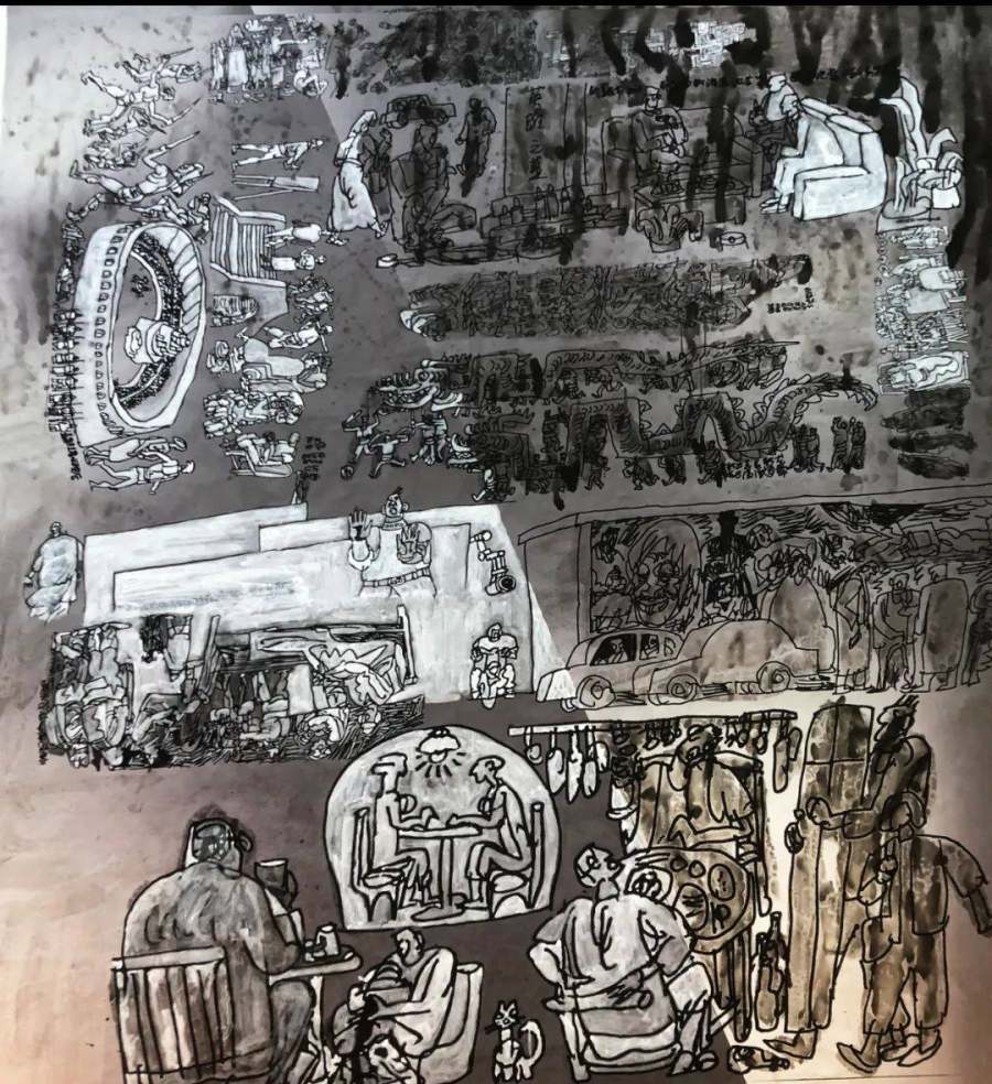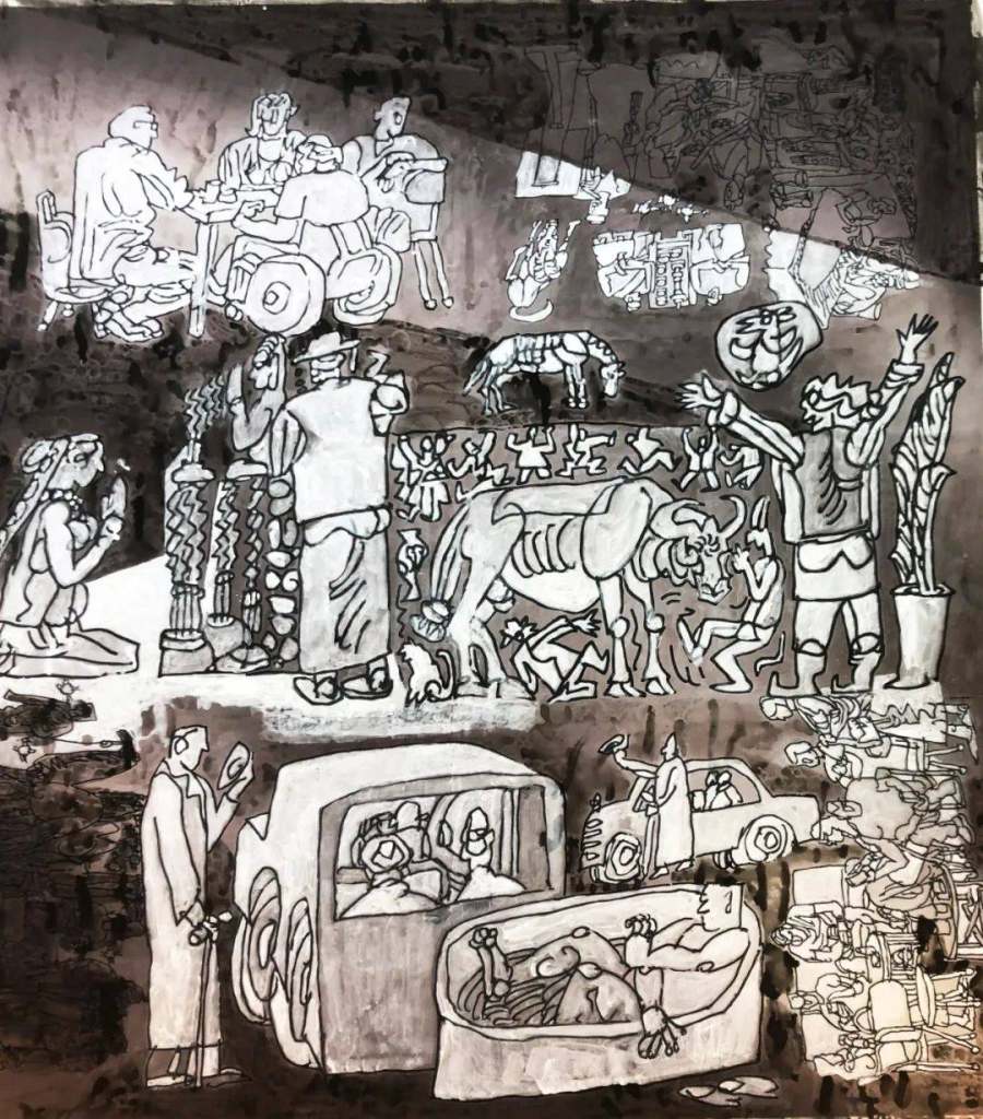 长安古道之苍茫,西域无垠之绿洲,无一不是其赤子心的体现。展览精心设计了主题探索、丹青意蕴、生活写生、水墨精神四大板块。其2025年新作《丝绸之路·人来人往》系列在上海首次亮相,打破了时间、空间、地理维度的跨度,冲击了一切民族与地域的局限,释放创作自由度,以超尺幅的水墨装置重构了丝路人文图谱。现场巨幅作品环绕展厅,无论是主题探索中《阿房宫赋》“盘盘焉,囷囷焉”的解构性的视觉冲击,还是《苦水社火》细密繁杂的民俗气象、生活写生中一组组截然不同的城市描绘,均表露出其扎根文化而诉诸新语的艺术哲学。
