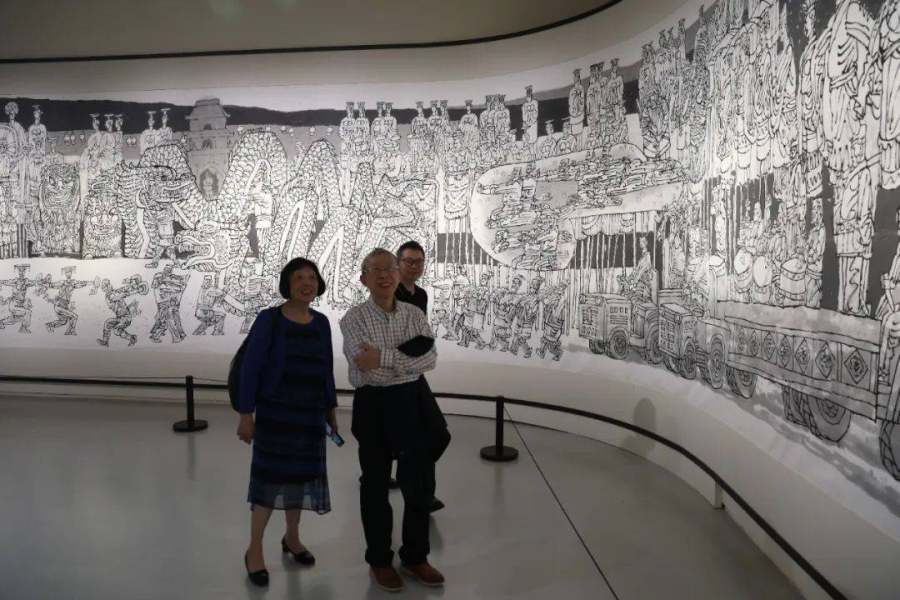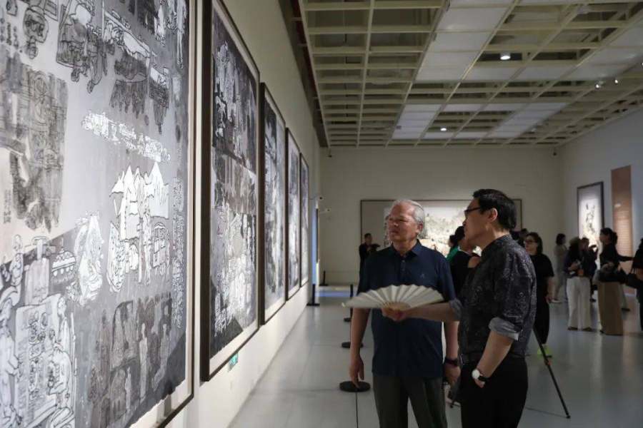 中央美术学院教授、博士生导师唐勇力表示,此次展览是杨晓阳创作实践中的阶段性成果。展览从造型语言形式、个性化笔墨符号及“大写意”精神的传达等角度完成了一场时间与地理维度上的奔赴跨越。在其独特的造型语言中,其秦汉气象的厚重以及横向仰视的视角方式,形成了空间交错的视觉效果。他对画作操作方法的重构,是漫长而坚定的自我演绎,画作体裁的灵活多变透露出浑然天成的创造想象力。在现场600余幅作品中,我们可以纵横观览到杨晓阳先生物我两忘的艺术精神的具象表达。