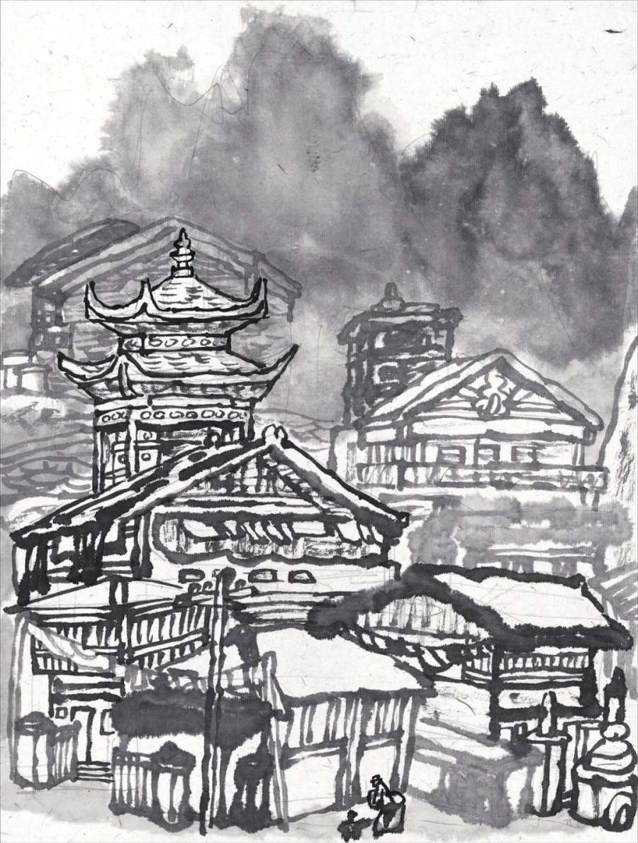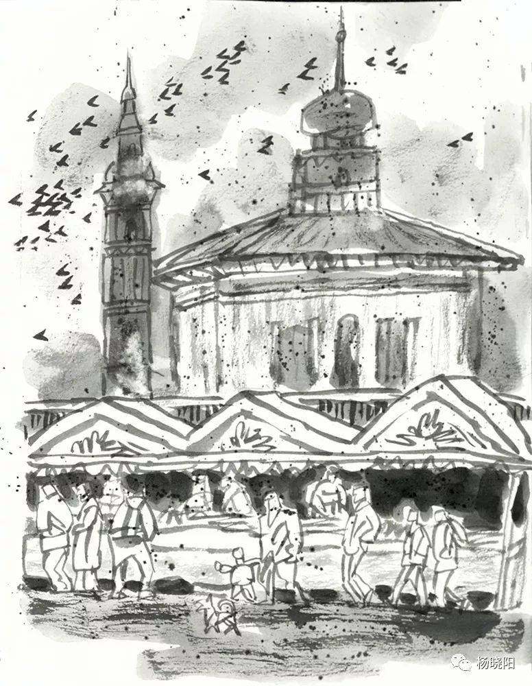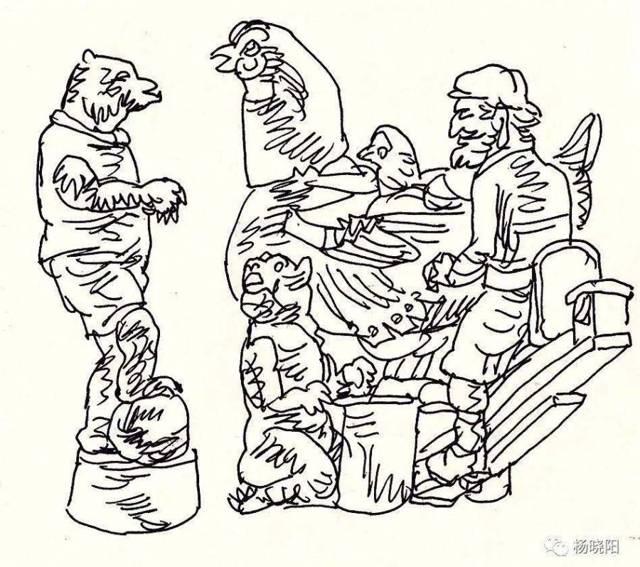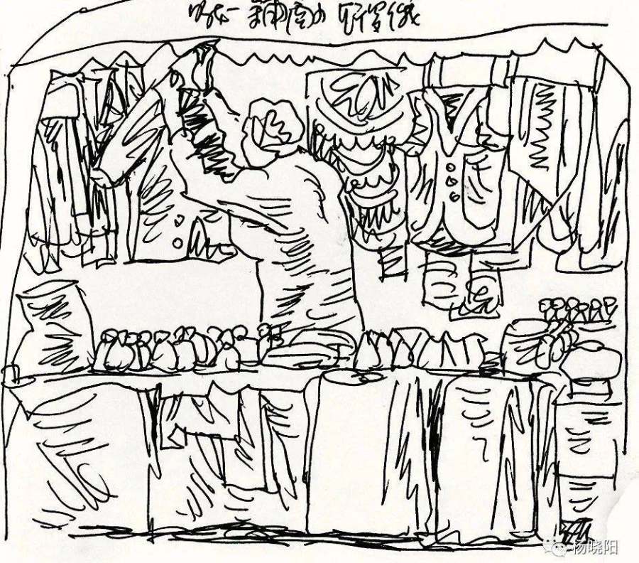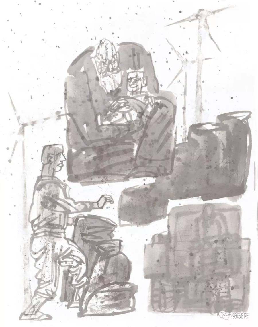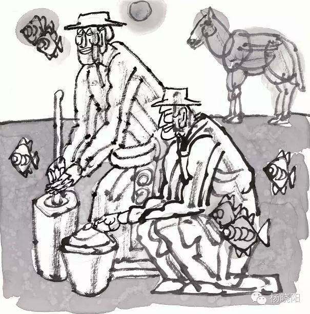 但是写生本身也是一种独立的艺术表现形式,体现出艺术家的思考和个性。应该注意的是,尽管写生这个概念来自西方,但在几十年的实践中已经融汇了中西两种写生的概念与方法,特别是在中国画的写生中,这种融汇显得更为突出。由此观察,杨晓阳的写生就是这种融汇的结果。杨晓阳继承了其老师刘文西坚实的造型和把握大场面的能力,非常重视到生活中去获取创作的灵感。他在几十年坚持不懈的写生中,积累了丰富的生活经验,练就了坚实的基本功,这也使他获得了快速把握多人物、多场景的复杂画面的手段。他的速写写生注重对对象的整体感受的表达,但同时又注意细节的丰富性。特别是他不仅形成善于构建画面的完整感和作品感的特征,而且也逐步形成了其朴实、生动、完整的速写风格。这为其水墨写意画奠定了基础,且已形成独立的艺术作品。