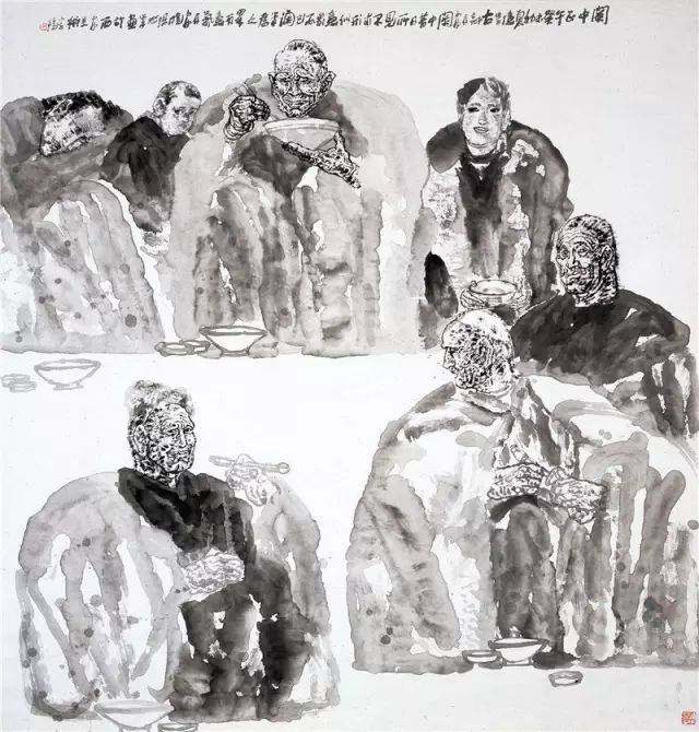 丰厚的生活积累和扎实的基本功在杨晓阳的主题性创作中完整地体现出来。他的早期创作将坚实的造型和形体塑造与中国传统的笔墨相结合,显示出对二十世纪以来中西融合趋向的深刻领悟与完整把握。这些作品在对题材的处理上不仅强调生活的鲜活性和生动性,而且体现出对生活意义的提炼与阐释。同时他又把这种生活之美置于历史的维度之中,从而使其作品在主题阐释和风格上都具有了深度。不管是其早期作品在语言上的繁复性和深度刻划,还是近二十年来日趋简洁化和写意化,杨晓阳的主题性创作都表现出在充分发挥形式语言作用的同时突出人物形象的塑造、深刻挖掘主题内涵、强调作品形式美感的特征,从而使其作品形成不同的语言形式与不同题材之间的统一与和谐。因此,他的作品总是在章法布局上呈现出多样性和丰富性,而这种对章法布局的重视又带来其作品结构上的严谨和清晰。所以其主体性创作的作品不仅将理性与感性有机结合在一起,而且具有很强的研究性。
