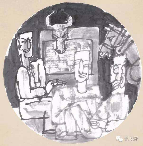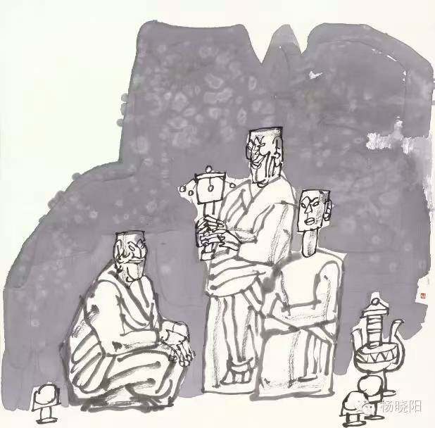 大约从2000年开始,杨晓阳开始着重致力于写意水墨画的探索和研究。他的大量速写为其水墨画实践奠定了风格上的基础。尤其是他近些年在造型上日趋简洁、概括,甚至呈现出几何化、程式化趋向,这对于艺术家来说,是一个从复杂、绚烂走向简括、平淡的过程,也是一个艺术家成熟的标志。也正因此,他的水墨画不仅在造型上进行了大跨度的变形,而且在构图上具有了平面构成的意味。这种表达方式看似吸收了现代艺术的因素,实际上是对中国传统造型方式的现代演化,其中包含了青铜器、汉画像石和诸如西北栓马桩这样的民间艺术等方面。更让我们注意的是,在依照中国传统造型法则吸收现代艺术形式语言的同时,他的水墨画仍然遵循了传统中国画以书入画的原则,将书法用笔揉入线条之中,使之画面更具变化和韵味。特别是他的石鼓和魏碑笔法不仅增加了线条的厚重和力度,也与他的古拙的造型相吻合。这些都体现了他题材模糊化、主题多义化、造型意象化、章法多维化、用笔书法化的艺术追求。杨晓阳也因此而在当代水墨艺术家中独树一帜。他清晰的四个段落表现出一种不断超越自己的艺术家的轨迹,给我们以深刻的启示。