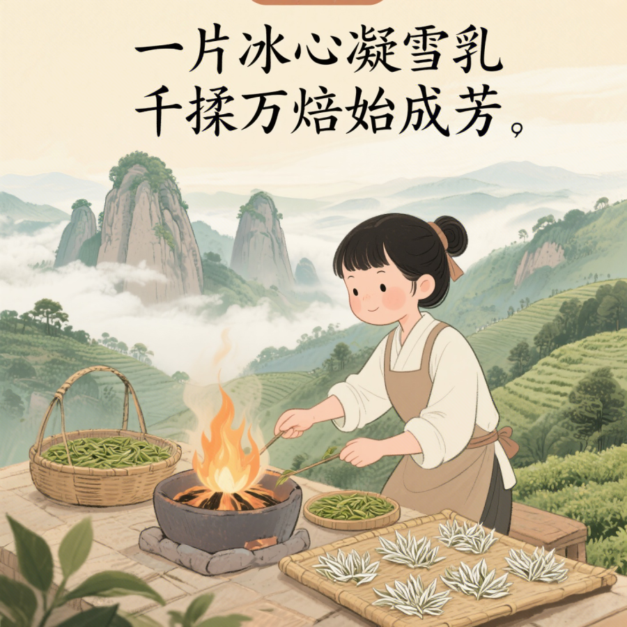 至若根深乃见叶茂,源远方得流长。玉昇既立,素志弥彰。太姥仙株,永系衷肠。岁岁春归,必躬故里茶冈。素手撷灵荈,承非遗之秘奥;冰心循古法,守三晾九焙之纲。火候精微,银针暗蕴星斗;萎凋玄化,玉盏尽纳沧浪。一片冰心凝雪乳,千揉万焙始成芳。白茶仙子,世所共仰;玉魄冰肌,清韵无双。