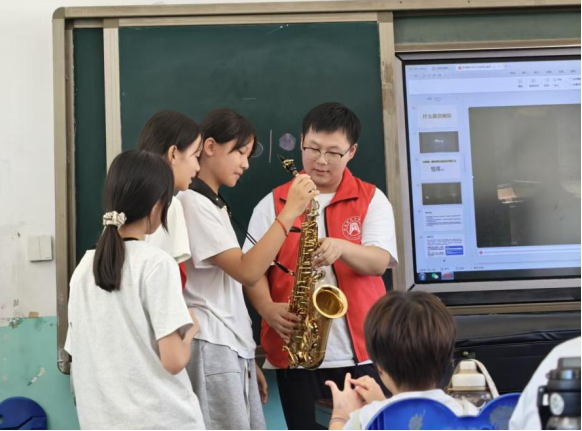 7月8日冯堂第一小学的一间教室里,二十几个孩子安安静静地坐在课桌前,聚精会神地盯着讲台上的志愿者老师。讲台上的老师手执一只木笛,指尖轻动,吹奏出如溪水般流淌而出的清脆旋律。孩子们稚嫩的嗓音跟着笛声一起飞扬,有的拍手打节奏,有的摇头晃脑,眼神专注得发亮,脸上洋溢着纯粹的笑容。