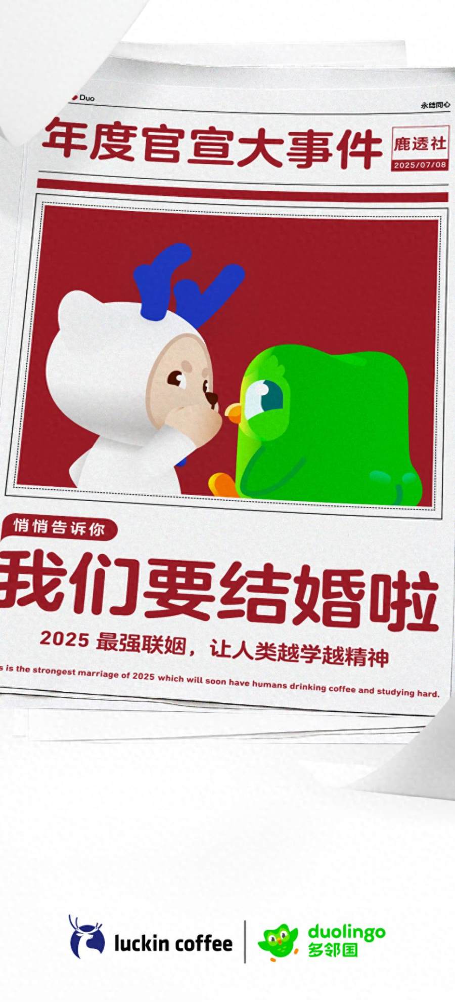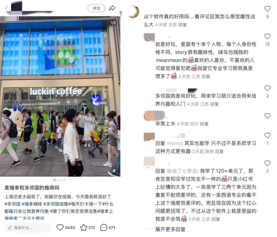 这场联名可谓是声势浩大。不仅多邻国和瑞幸的“婚礼请柬”全网发、联名水杯被一夜抢空,在“婚礼”预告前期更是惊动了半个品牌圈纷纷在评论区P婚纱照、抢新郎名额……