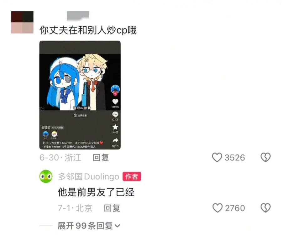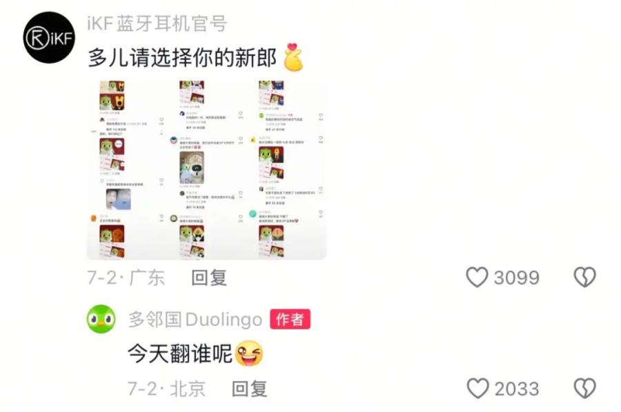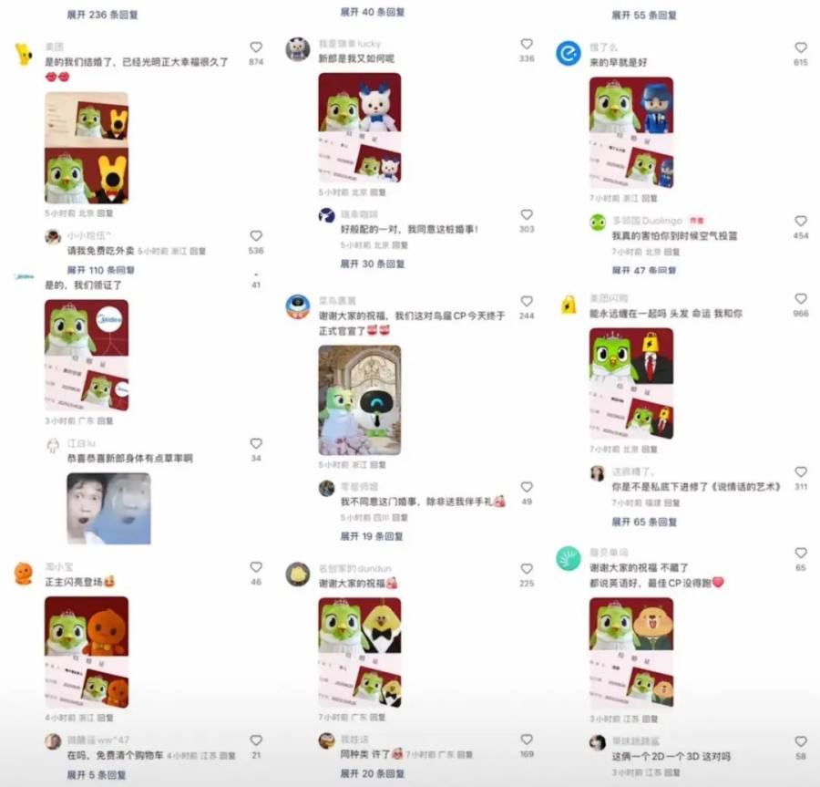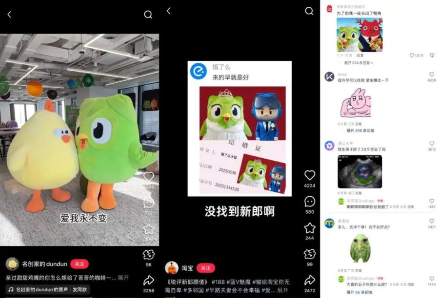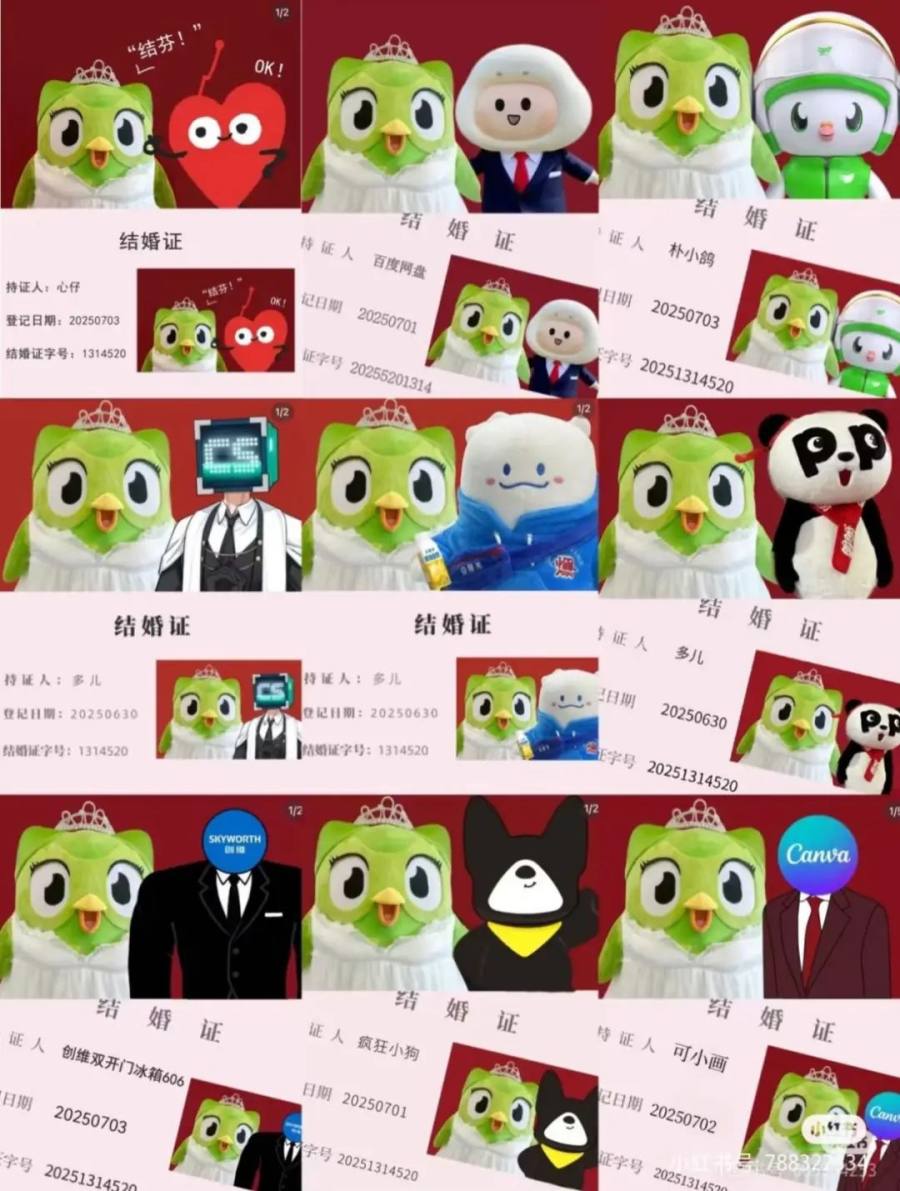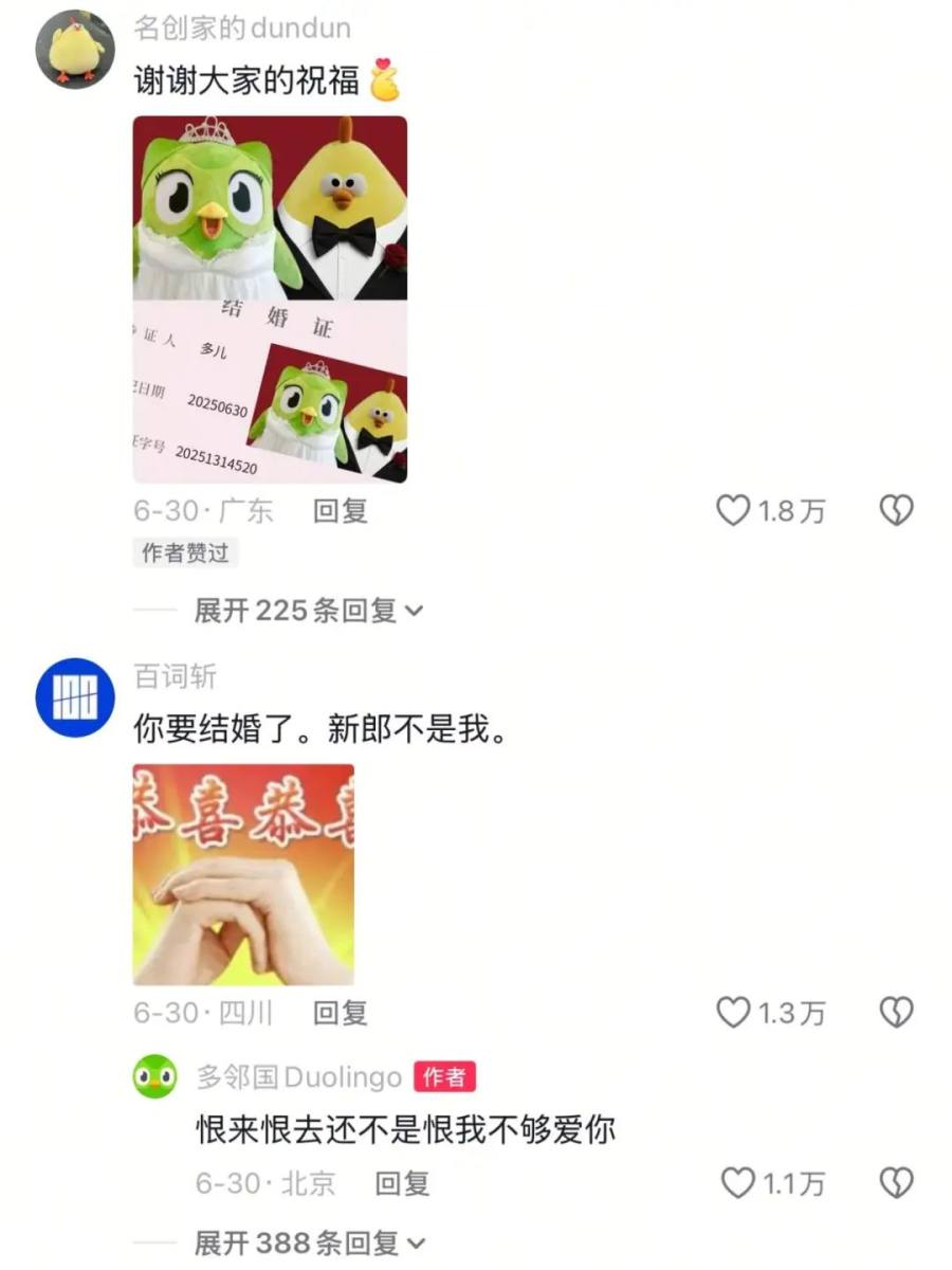 接下来的评论区一发不可收拾。名创优品的墩墩鸡火速P了一张自己和多儿的结婚证照片,附文:“谢谢大家的祝福”;多邻国的“对家”竞品百词斩评论:“你要结婚了,新郎不是我”,多儿一针见血:“恨来恨去还是恨我不够爱你”,好一场恨海情天大戏。