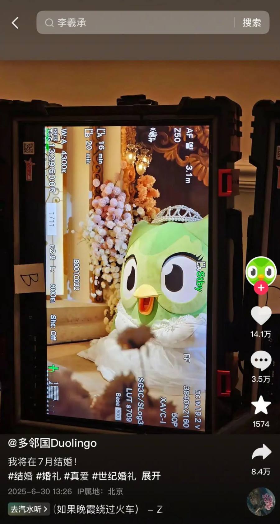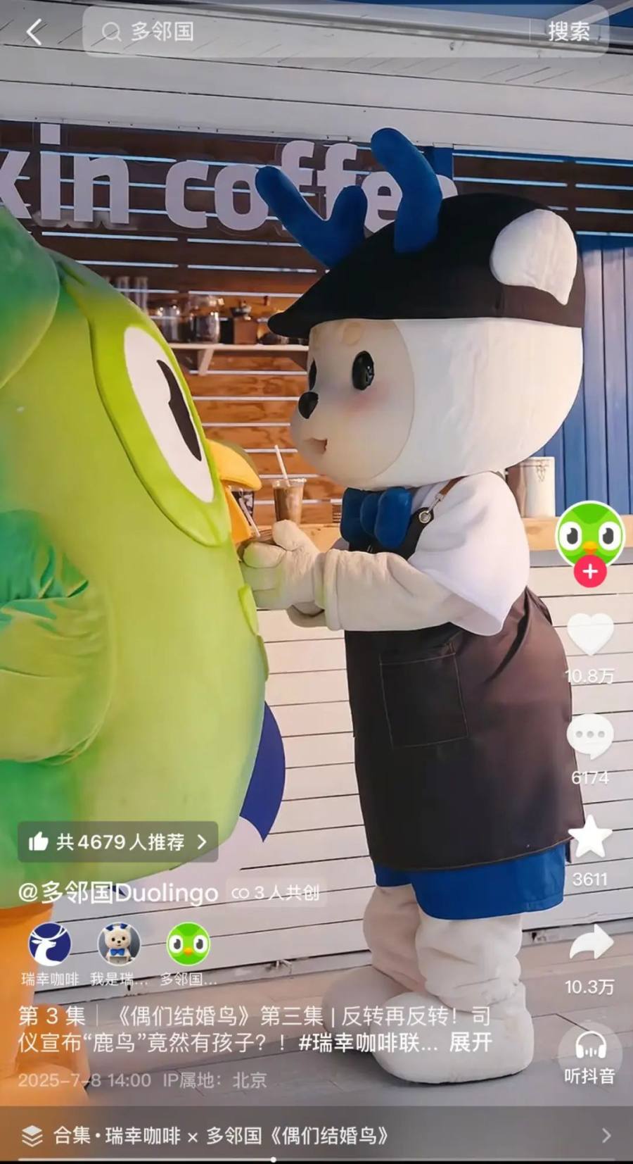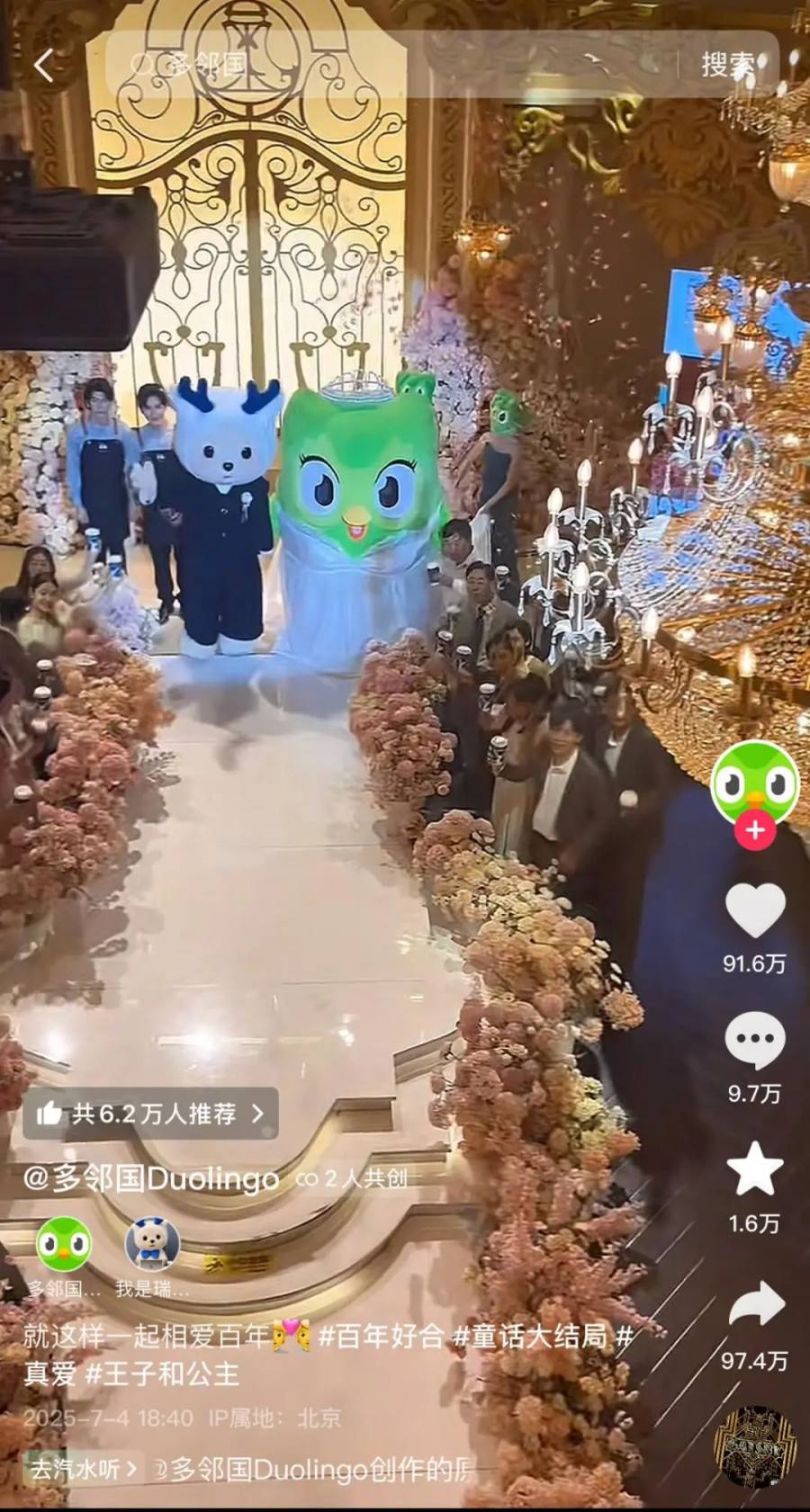 终于,这场持续多天的抽象玩梗、品牌互蹭的闹剧,在7月4日这天迎来了剧情高点:多邻国终于官宣真正的新郎——瑞幸的小鹿Lucky。在前几天多邻国和其他品牌的不断造势下,这条“官宣视频”也收获了抖音91.6万点赞、9.7万评论、1.6万收藏、97.4万转发的泼天流量。