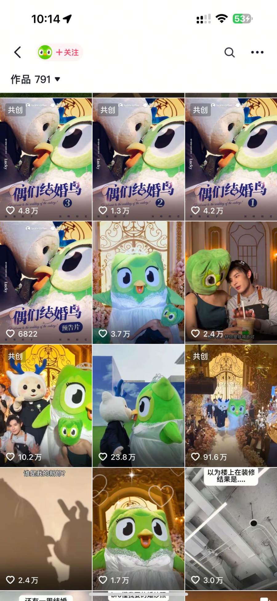 最爱玩梗的多邻国和最爱联名的瑞幸强强联手,也让这次联名的效果十分火爆,不仅首条官宣视频爆火出圈,其他婚礼的相关视频也几乎是抖音点赞数条条破万。在官宣联名之后,还接连发布了三集《偶们结婚鸟》的短剧,drama的剧情推进下,在故事的结局,终于推出本次联名的新品绿沙沙拿铁。
