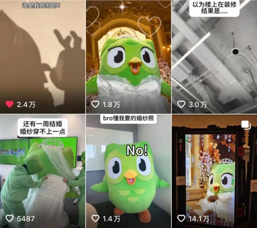 在联名官宣前,多儿声势浩大、代入感极强的婚礼预告,像现实结婚一般的试纱、试妆、婚纱照拍摄流程,就已经吸引了多邻国一直以来的粘性用户进行玩梗,稳固了联名的热度保持。
