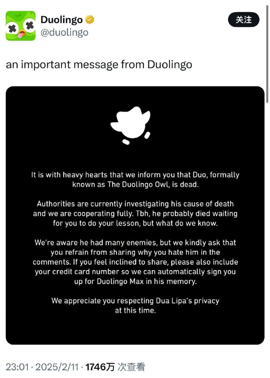 多邻国在宣布多儿“死亡通知”的同时还表示,正在调查多儿死因:“当局目前正在调查他的死因,我们将全力配合。老实说,他可能是在等你们上课时死去的,但谁又知道呢?”
