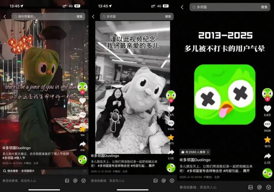 爆火背后,是多邻国始终如一、贯彻到底的人格化营销。多邻国的这只常年混迹互联网、拿短视频热点当饭吃的小绿鸟多儿,此前也曾凭借“死亡营销”成功在全球出圈,拉动多家国际游戏厂商下场玩梗。