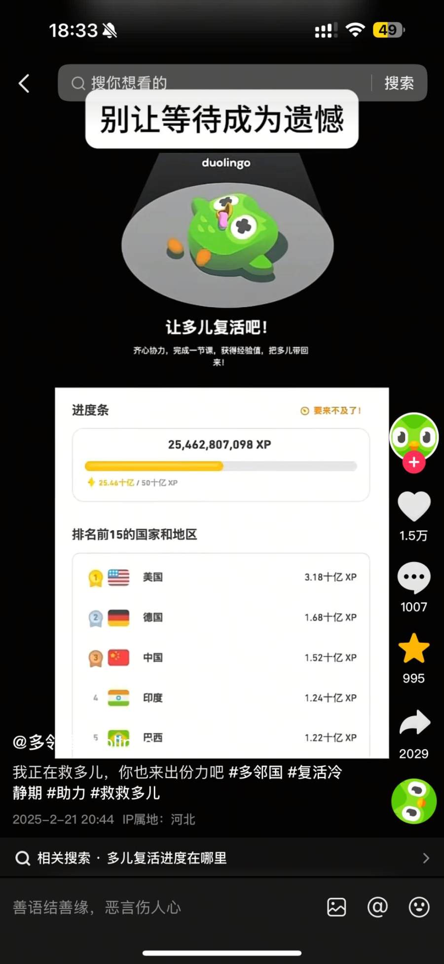 原来这一切都是多儿督促用户打卡连胜的诡计。多邻国官方真的开始了“复活行动”,号召全球用户一起打卡,助力多儿复活。
