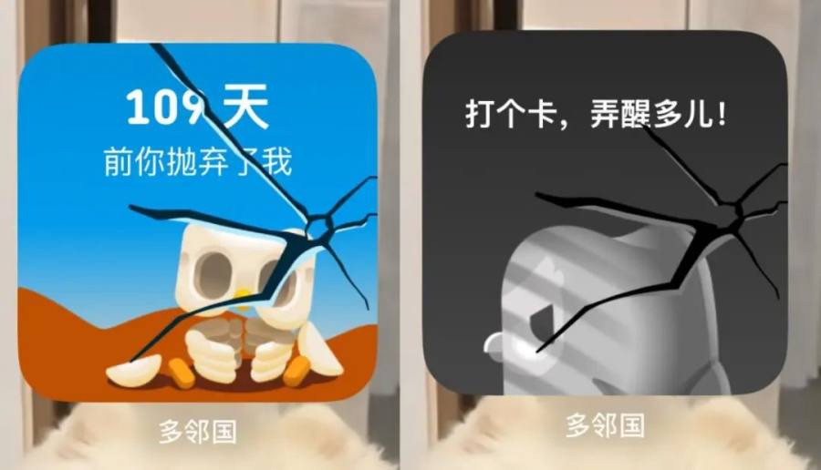 其实,一开始的多儿,人设并没有像今天一样丰富。刚开始“玩网”的它,只是一只爱跟在用户屁股后面反复提醒打卡的唠叨绿鸟。这个互联网人设,与多邻国APP设置的“打卡提醒”小组件模式相近,当用户的打卡连胜断掉,多儿就会在主屏幕愤怒、悲伤、甚至昏迷。