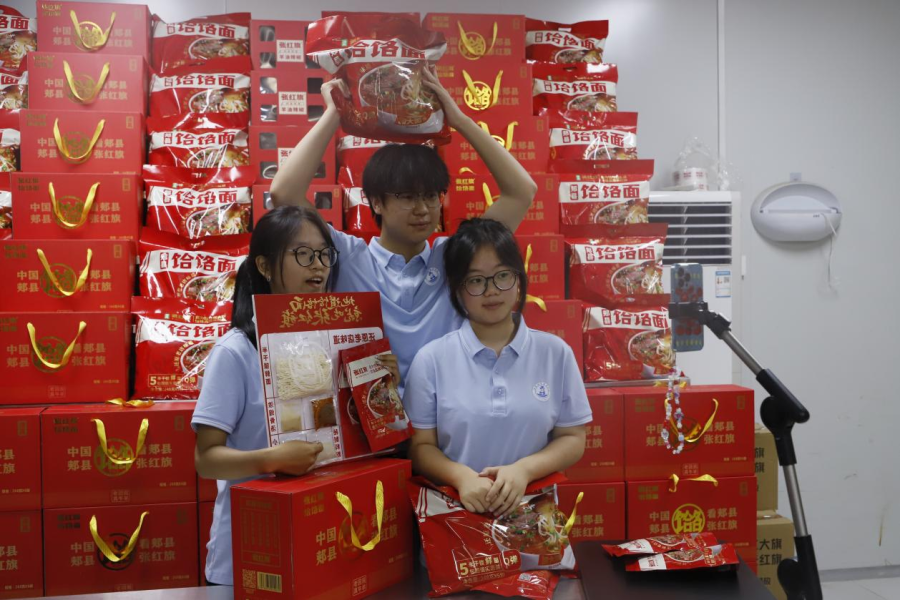 团队成员正在现场烹煮速食饸饹面,辅以郏县红牛肉和羊油辣子。直播间里香飘四溢加上成员们的热情讲解引动下单热潮,为企业直播间注入青春活力。“学生用新媒体让‘郏县味道’破圈!”企业负责人连连点赞,“这就是青春力量!”