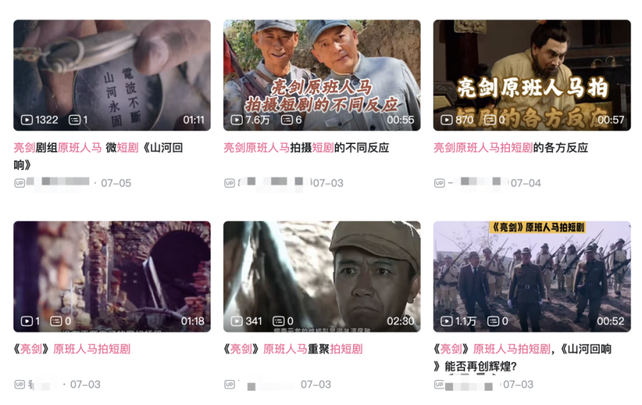 事实也的确如此。“《亮剑》原班人马拍短剧”的消息一经发出便引发全网关注,抖音平台上,相关热点话题吸引了827.8万人围观;在微博,新华社领衔的众多蓝V账号也发布了相关资讯,并且带上了#亮剑原班人马拍短剧山河回响#的话题;而在《亮剑》剧迷扎堆的B站,有UP主制作了“亮剑原班人马拍短剧的各方反应”的混剪视频,精准“预测”粉丝们的心理活动。
