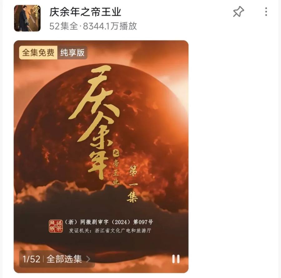 网络数据显示,《庆余年之帝王业》上线仅72小时,播放量便突破了6000万,相关话题累计播放量超3亿。而在上线一年多后,《庆余年之帝王业》截至目前在抖音平台的总播放量已经超过了8300万。