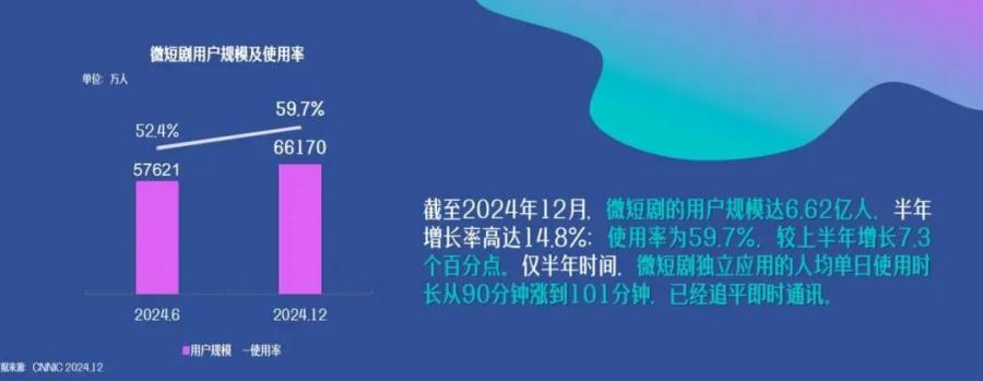 有行业机构预估,2024年我国微短剧市场规模将达504.4亿元,呈现稳步增长态势,市场规模有望首次超越电影市场。而今年3月发布的《中国网络视听发展研究报告(2025)》显示,截至2024年12月,微短剧用户规模高达6.62亿,半年增长高达14.8%。