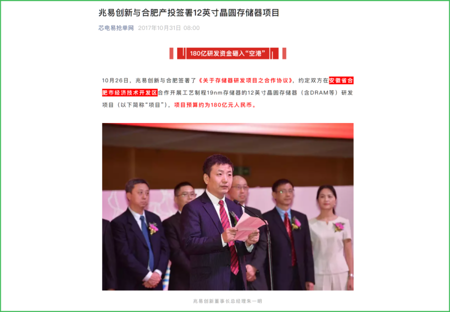 故事的一方,是当时已凭借NOR Flash(一种利基型存储芯片)成为全球知名存储龙头的兆易创新及其创始人朱一明。在尝试收购DRAM厂商北京矽成失败后,朱一明决心另起炉灶进攻DRAM。而另一方,正积极谋求产业转型升级、以“最牛风投城市”声名鹊起的安徽合肥,需要一个破局者。两者一拍即合。