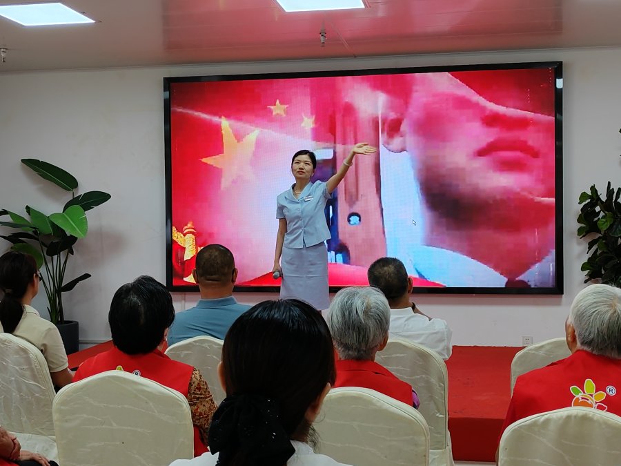 在文艺表演环节,锦源老年公寓预备党员王芳以一曲独唱《我和我的祖国》拉开序幕。她深情的嗓音与悠扬的旋律交织,表达了对祖国的无限热爱,现场观众自发跟随节奏轻声合唱,气氛温馨而庄重。