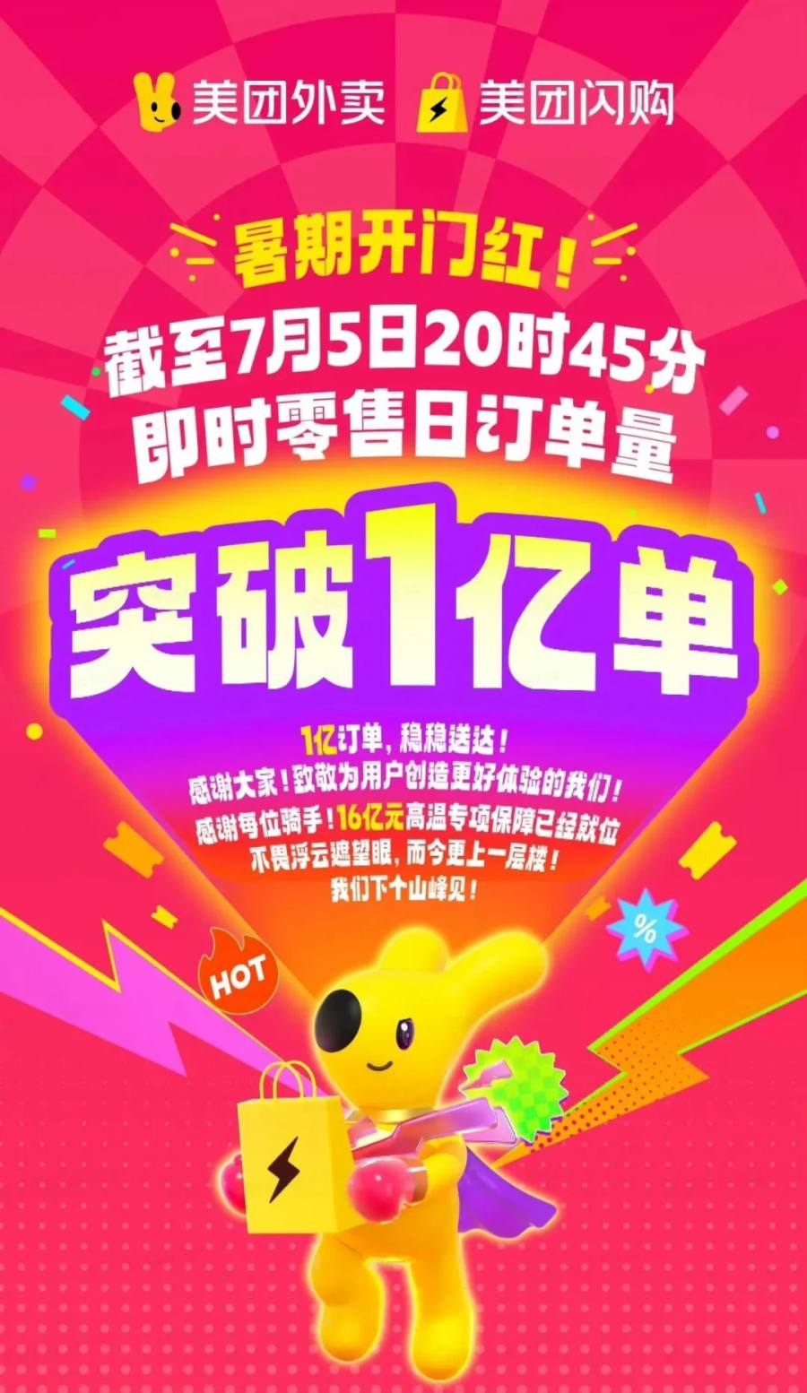 再来看美团战报。7月5日20时45分,美团平台即时零售日订单量突破1亿单,截止到22时54分,美团日订单量突破1.2亿单,其中餐饮订单突破1亿,在两个小时左右的时间里,美团单量上涨2000万,这一涨幅可以说相当恐怖。7月5日外界下单量的激增,甚至一度触发了美团的服务器限流保护,导致平台小范围地区用户出现了短时服务异常。