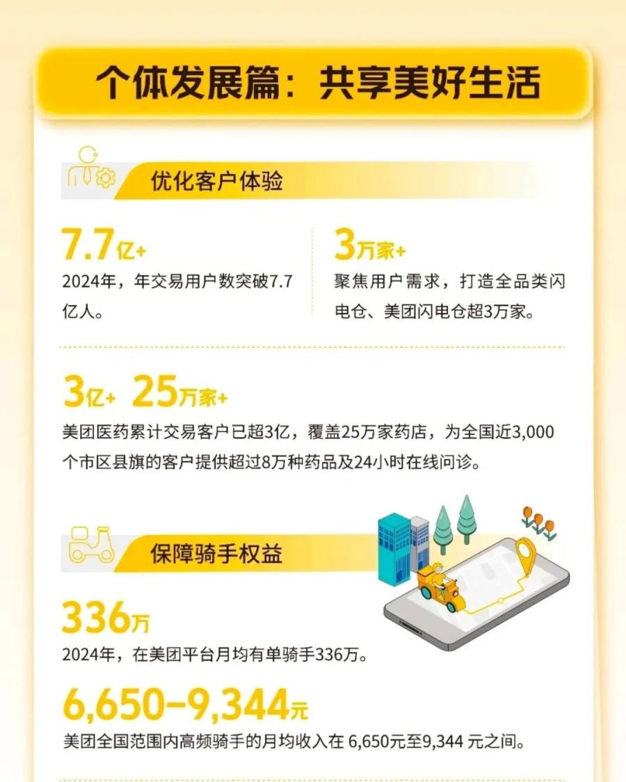 2024年,美团年交易用户数突破7.7亿,支撑这7.7亿消费者体验的,是月均336万的有单骑手、1450万户活跃商家、211亿研发成本、超45万单的无人机配送等等。