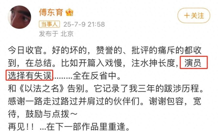 导演兼编剧傅东育在舆论发酵后发文,针对市场反馈作了总结反省,其中一句“演员选择有失误”让剧粉情绪再次失控,怒评导演是在“甩锅”。
