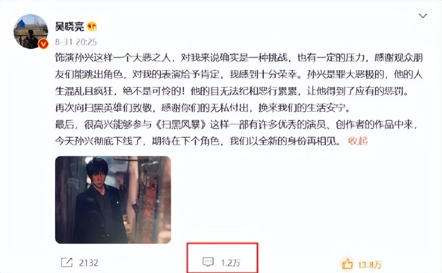 《扫黑风暴》播出前,饰演孙兴的吴晓亮微博评论数平均100+,播出后不仅搜索指数持续提升、最高达单日近18000次,就连微博评论也多次破万、并至今仍维持在3000+,流量数据明显翻倍。