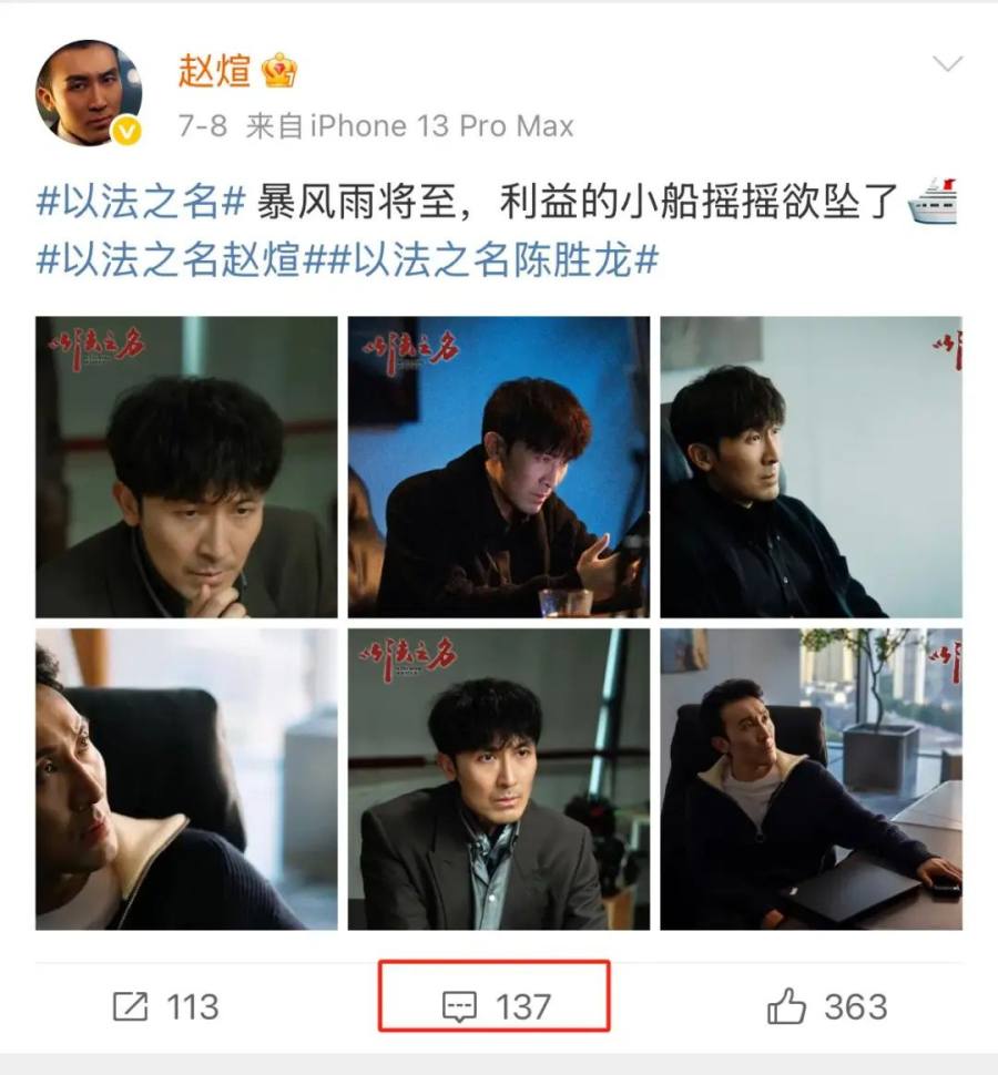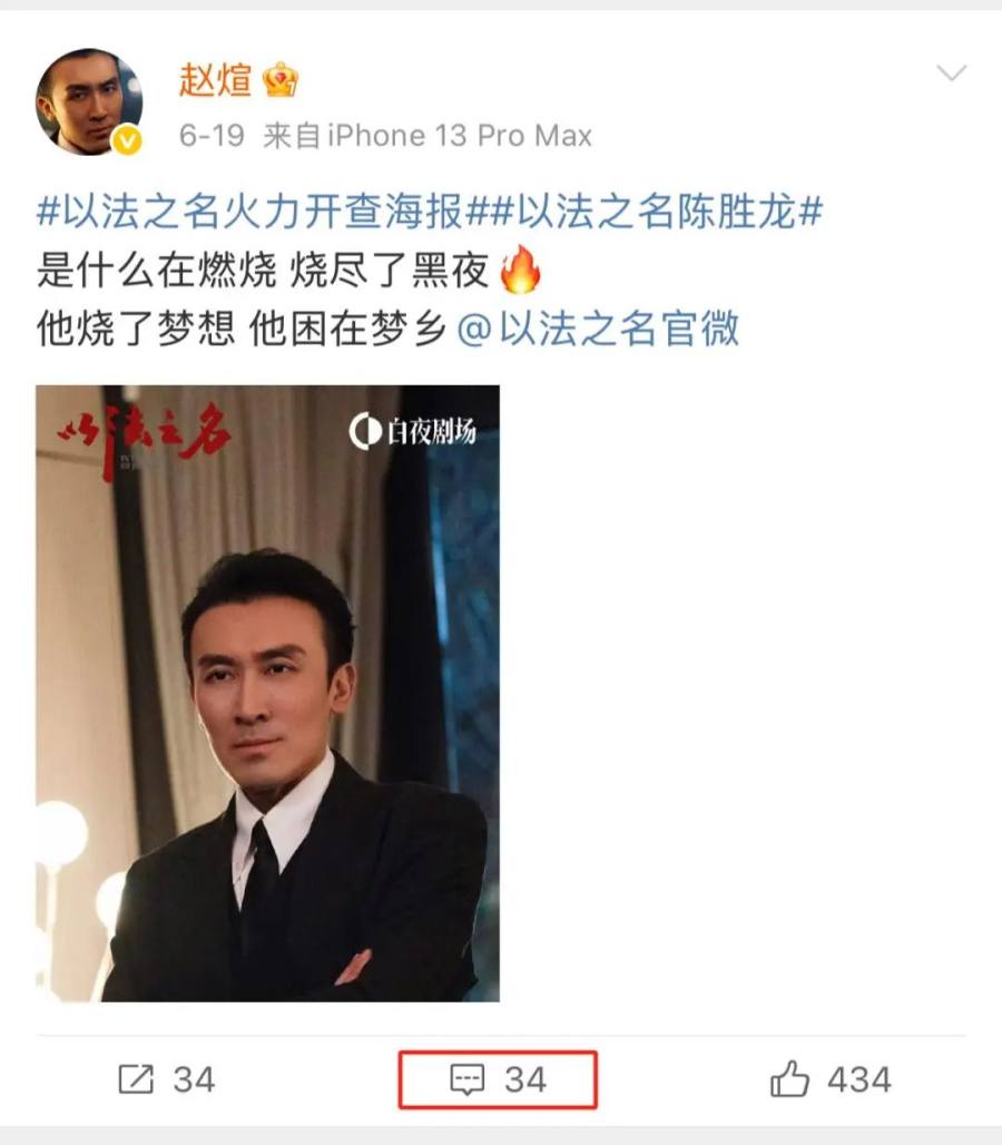 《以法之名》中饰演陈胜龙的赵煊却没能借演反派实现明显的流量飞升,剧播前其微博平均评论在30+,播出后则稳定在100+,微弱的增长更像剧集热度的自然带动,而非角色本身赋予演员的破圈动力。
