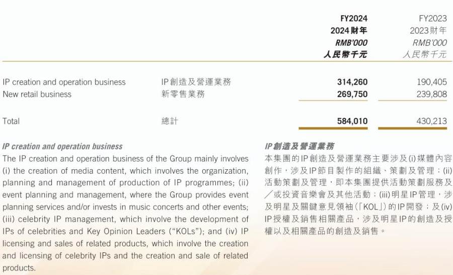 需要注意的是,在巨星传奇两大业务实现增长的时候,其IP创造及营运业务的另一主要收入来源——明星IP管理业务,即巨星传奇通过与明星及KOL合作,从品牌拥有者获得赞助、推广费用及佣金产生的收入,相较2023财年,下滑了约8.43%。
