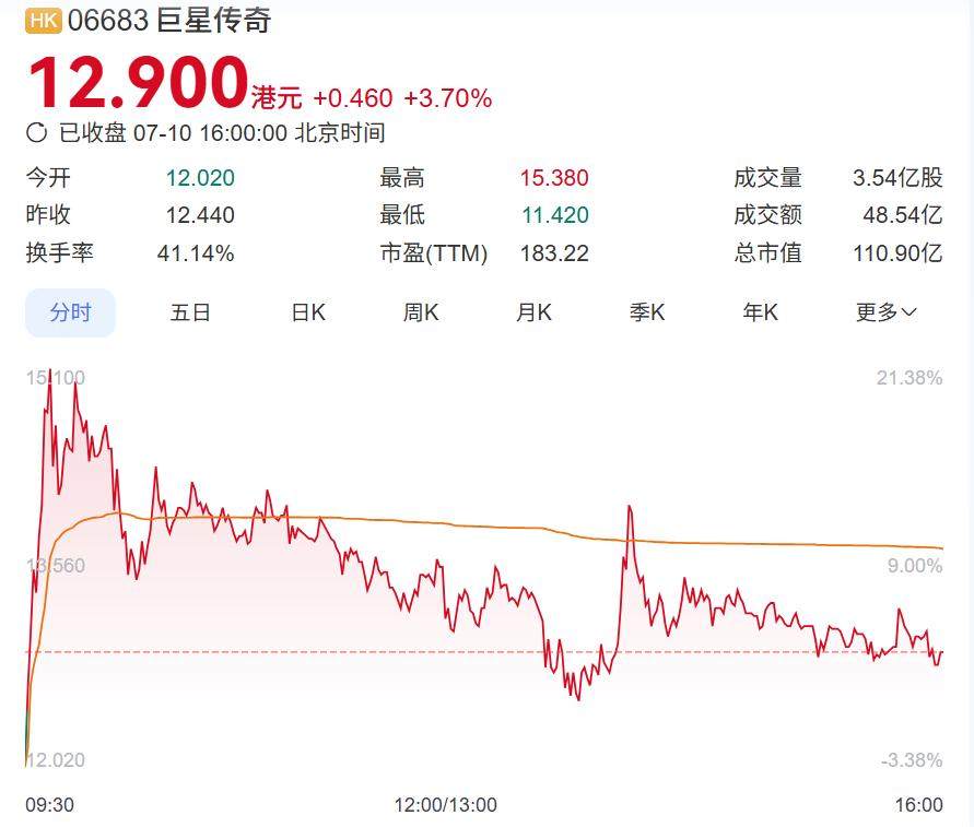 这其中,最引人瞩目的,无疑是被称为“周杰伦概念股”的巨星传奇。7月9日盘中,巨星传奇一度涨超160%,盘中股价最高触及17港元/股,市值突破百亿大关。截至当天下午收盘,巨星传奇收涨94.38%,股价报12.44港元/股,市值为106.9亿港元。7月10日,巨星传奇开盘下跌,随后再次上涨,截至收盘,报12.9港元/股,上涨3.7%,总市值为110.9亿港元。