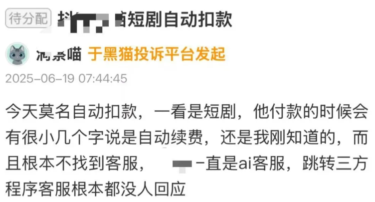 有用户反映,抖音短剧莫名自动扣款,付款的时候会有很小几个字说是自动续费,而且根本找不到客服,主站一直是AI客服,跳转到三方程序客服根本都没人回应。