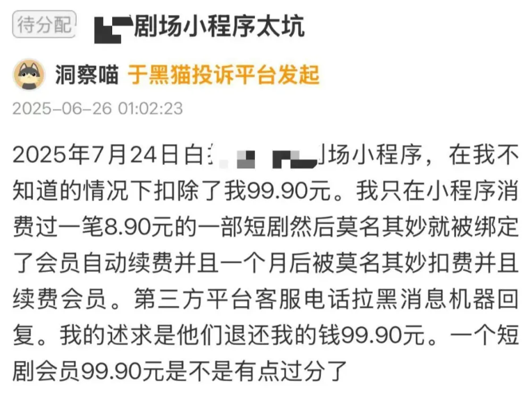 也有人说,某剧场小程序太坑,在不知道的情况下扣了99.9元。只是在小程序消费过一笔8.9元的一部短剧,然后莫名其妙被绑定了会员自动续费,并且一个月后被莫名其妙扣费,并非续费会员。第三方平台客服电话拉黑消息机器回复,一个短剧会员99.9元是不是有点过分了。