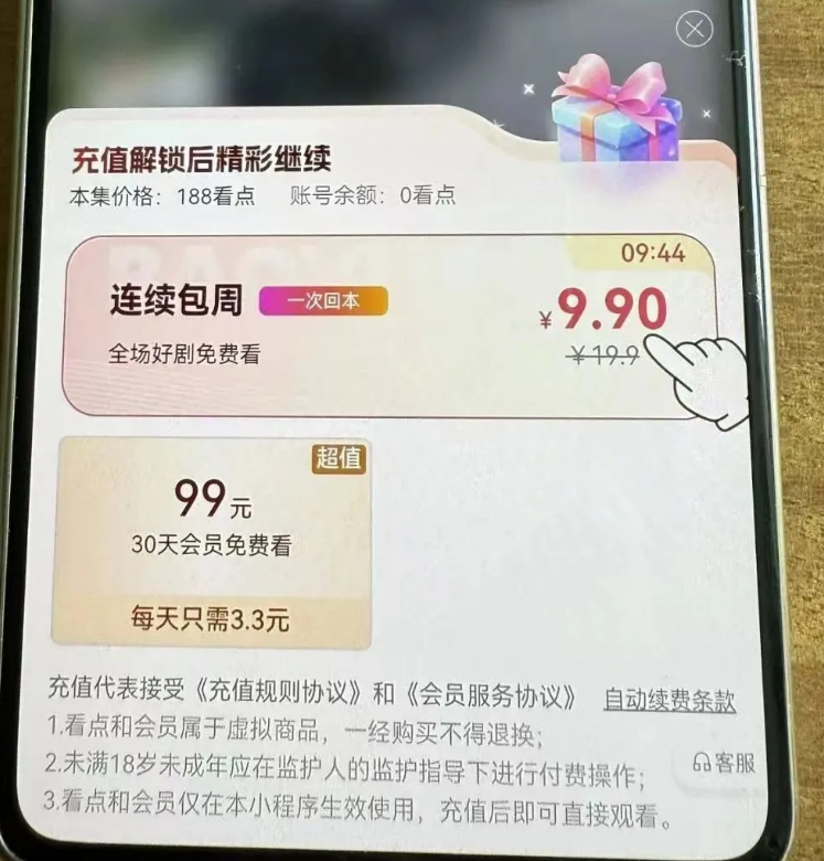 目前很多短剧平台上,会跳出充值解锁页面连续包周一次仅需9.9元,全场免费看。