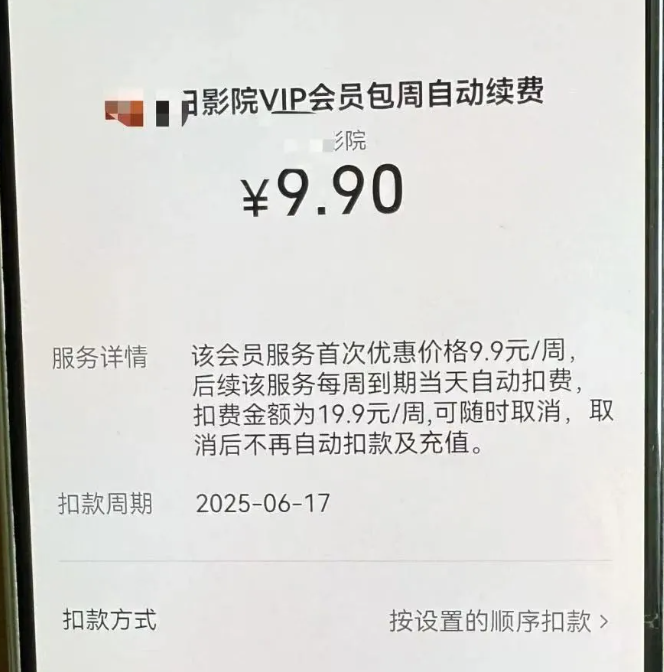 付款前,还会强调该会员服务首次优惠价格9.9元/周,后续该服务每周到期当天自动扣费,扣费金额为19.9元/周,可随时取消,取消后不再自动扣费及充值。