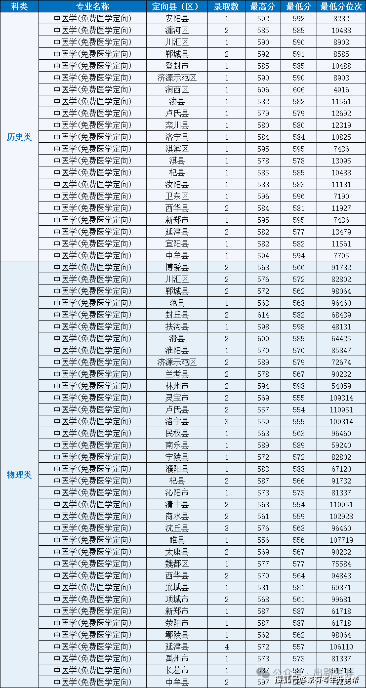 其中:中医学(免费医学定向)共录取85人。历史类录取25人,最高分606分,最低分577分;物理类录取60人,最高分614分,最低分554分。