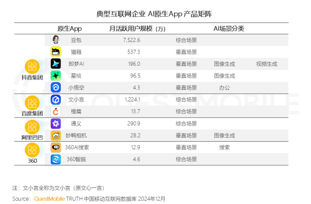 时间来到2024年底,QuestMobile2024年AIGC应用发展年度报告数据显示,豆包月活跃用户已突破7500万。