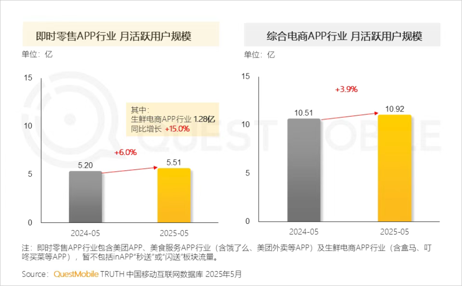 QuestMobile 数据显示,截止到 2025 年 5 月份,围绕“高时效即时服务”而形成的即时零售 App 行业月活跃用户规模已达 5.51 亿,流量增速优于综合电商 App。