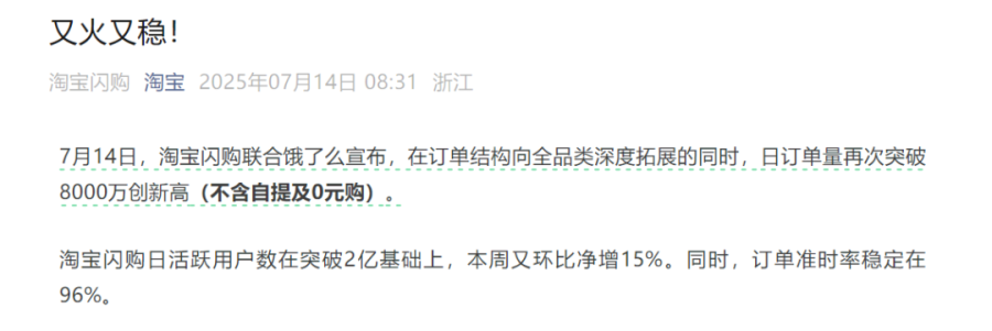 而淘宝闪购联合饿了么 7 月 14 日上午发布的战报,除了宣布日订单量再次突破 8000 万,特别注明了不含自提及 0 元购。