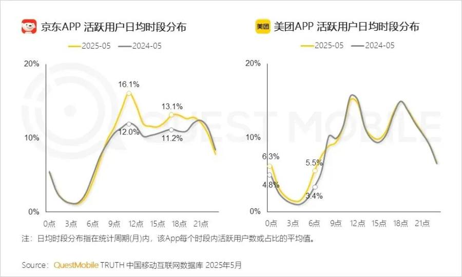 同样,京东与美团各自 App 5 月的同比数据,也显示用餐高峰时段活跃用户比例提升。其中今年才入局外卖业务的京东同比变动更为明显,午间和晚间的涨幅分别为 4.1% 和 1.9%。