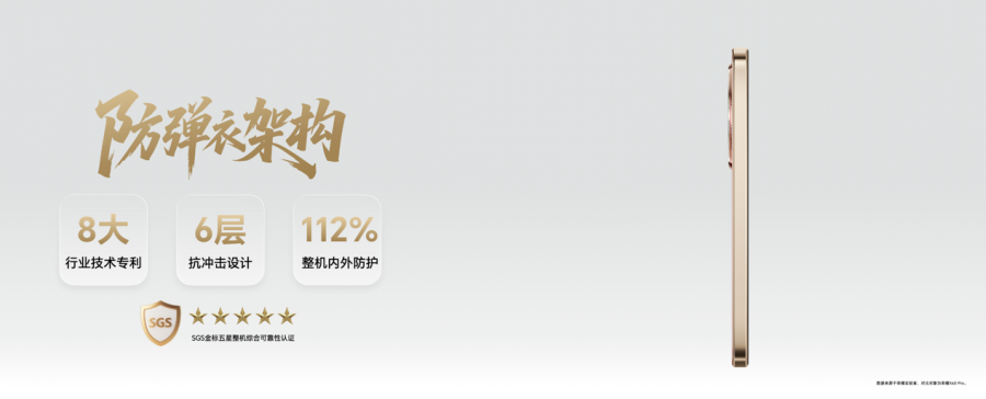 荣耀X70在上一代“满级抗摔”基础上又有新突破,将防摔高度提升至行业领先的2.5 米,并且首创“防弹衣架构”、应用旗舰折叠屏同源创新材料,通过架构与材料的双重突破,实现十面里外抗摔的出色表现。荣耀X70采用6层抗冲击设计,融合8大行业技术专利,整机内外防护能力相较荣耀X60 Pro提升112%,是行业首个通过SGS金标三防认证,并且通过SGS五星整机综合可靠性认证的产品;机身内部行业首次应用航天级非牛顿流体材料,吸能缓震性能相较荣耀X60 Pro提升300%,既能在跌落时保障机身外部完好,更能显著降低内部元器件的损伤风险。