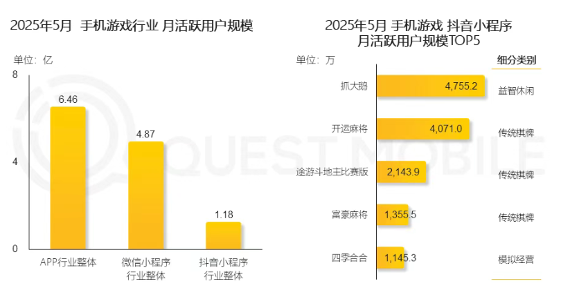 据QuestMobile数据,字节小程序游戏月活用户已达1.18亿,占整个行业规模近五分之一,其中,棋牌、消除、模拟经营等休闲类小游戏受到用户青睐。