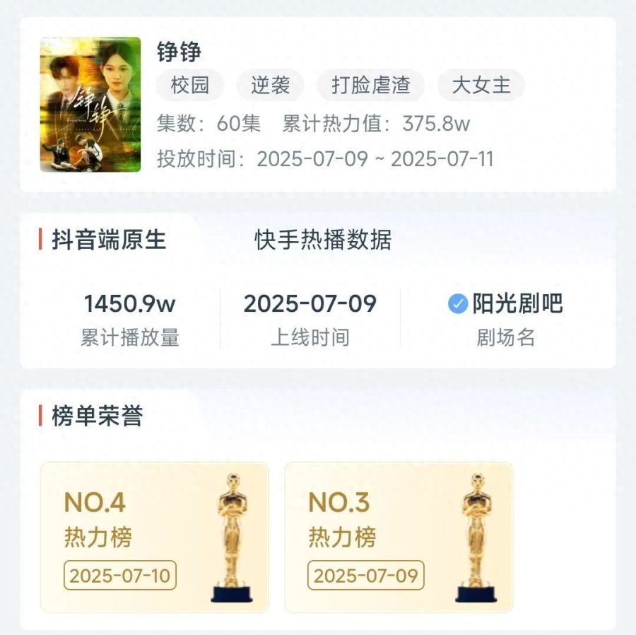 《铮铮》改编自知乎同名小说《铮铮》,一共60集,上线首日即登上热力榜榜单,位列第3位,上线后连续四日位于热力榜前列,截止7月12日,该剧累计热力值达到584.5w。7月12日登快手热播榜TOP2。抖音端原生播放量3491w,快手累计播放量448w。