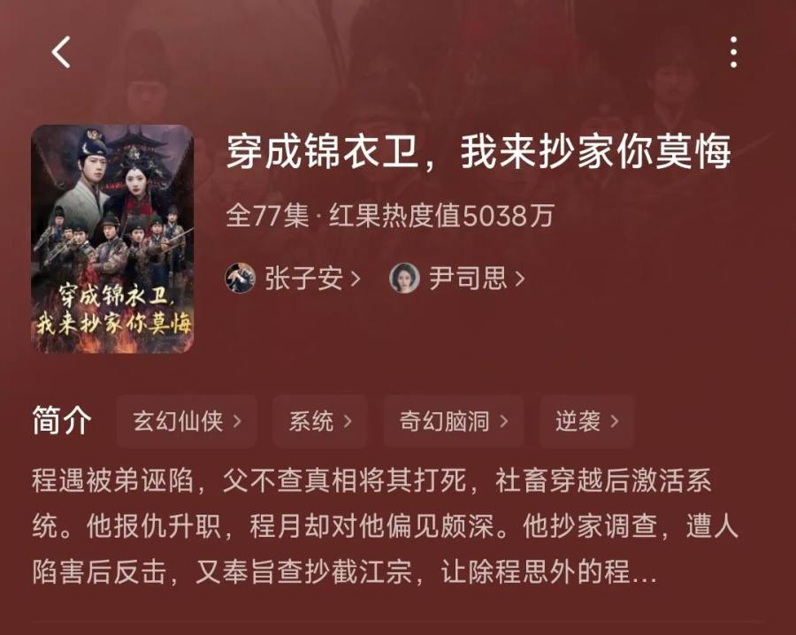 《穿成锦衣卫,我来抄家你莫悔》一共77集,截止7月11号,该剧累计热力值44.7w,红果热度值达到5038w,位列红果热播榜第55位,飙升榜第5位,快手热播累计播放量为21.9万,收获34万次点赞,收藏量为9.7万。
