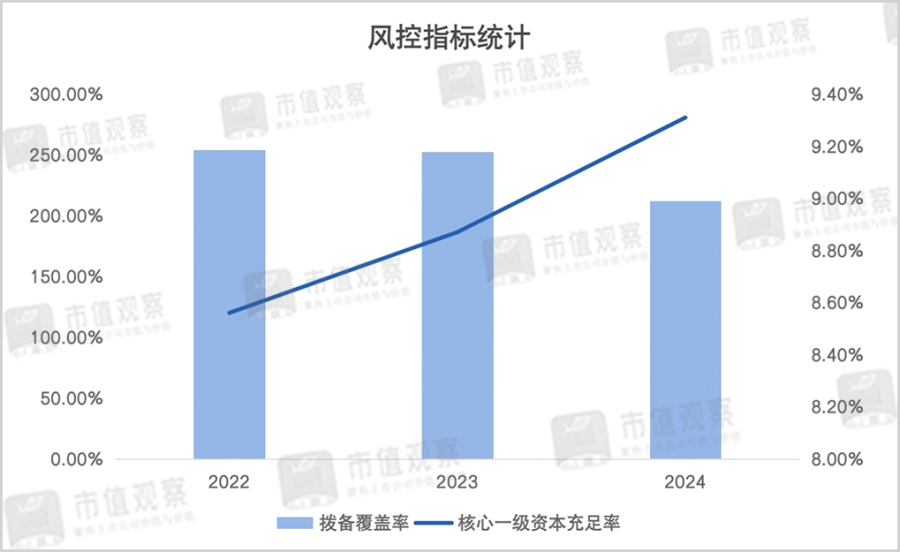 通过一系列募资补血动作后,东莞银行资本金压力稍有缓解。到2024年核心一级资本充足率逐步提升至9.31%,但仍低于同期11%的行业平均水平。