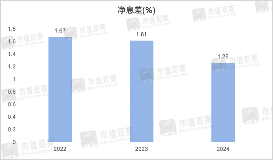 2024年东莞银行的净息差从2023年的1.61%下降到1.26%,降幅达0.35%,明显低于行业1.52%的平均净息差,在A股上市城商行中排名倒数第三。
